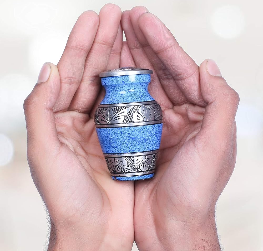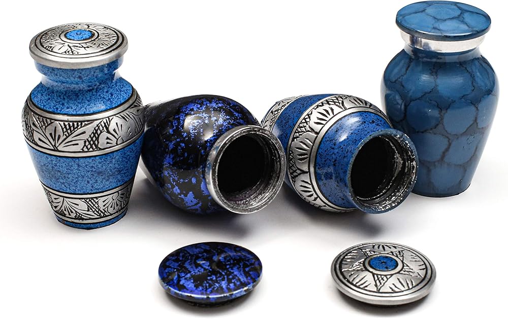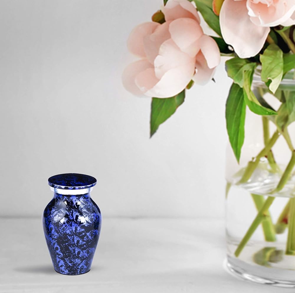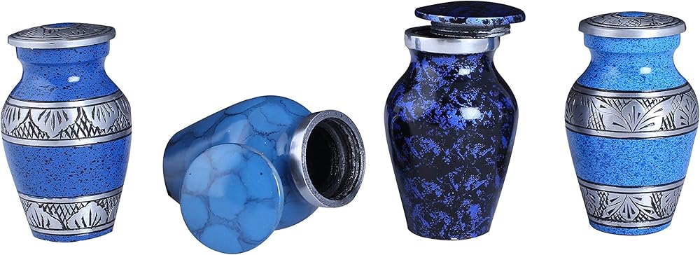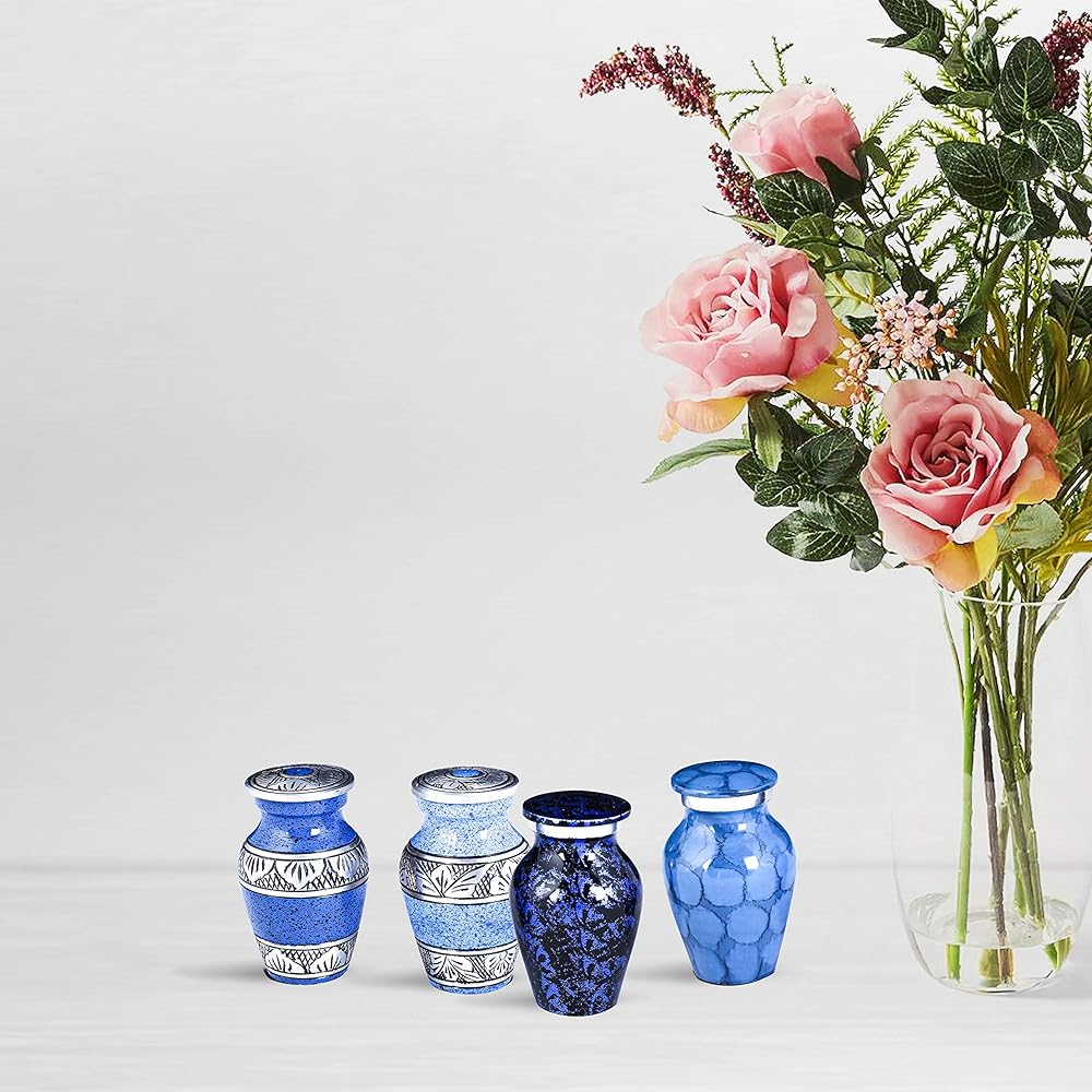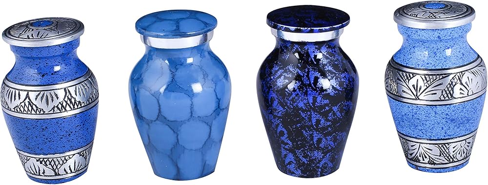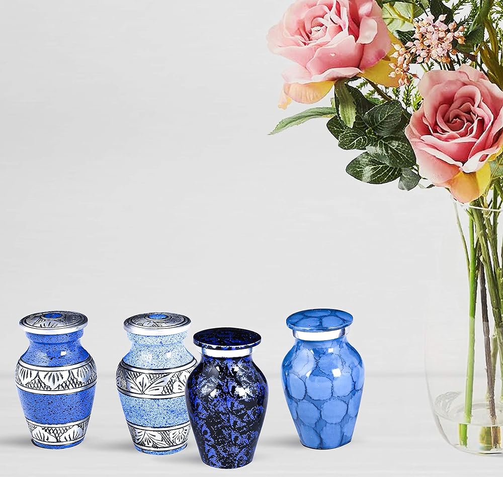 مجموعة جرة للرماد البشري مكونة من 4 قطع صغيرة - جرة جميلة ومتواضعة لأحبائك. هذه الجرة الجميلة ستمنحك الراحة في كل مرة تراها بمقاس 2.8 × 1.7 بوصة - مجموعة زرقاء