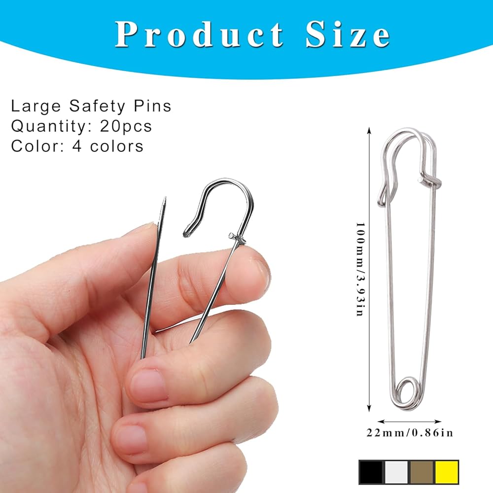 Optimal Size and Quantity: Our 4-inch or 10cm safety pins are crafted for versatility. Each pack boasts a generous count of 20 pieces, with 4 colors. ensuring you have an ample supply for various applications. The ideal combination of size and quantity sets us apart for all your pinning needs.
