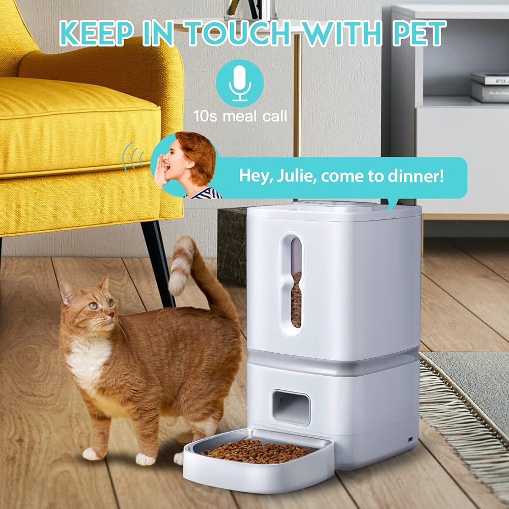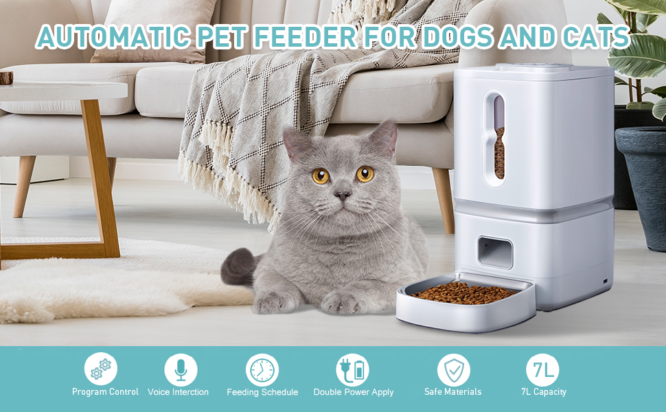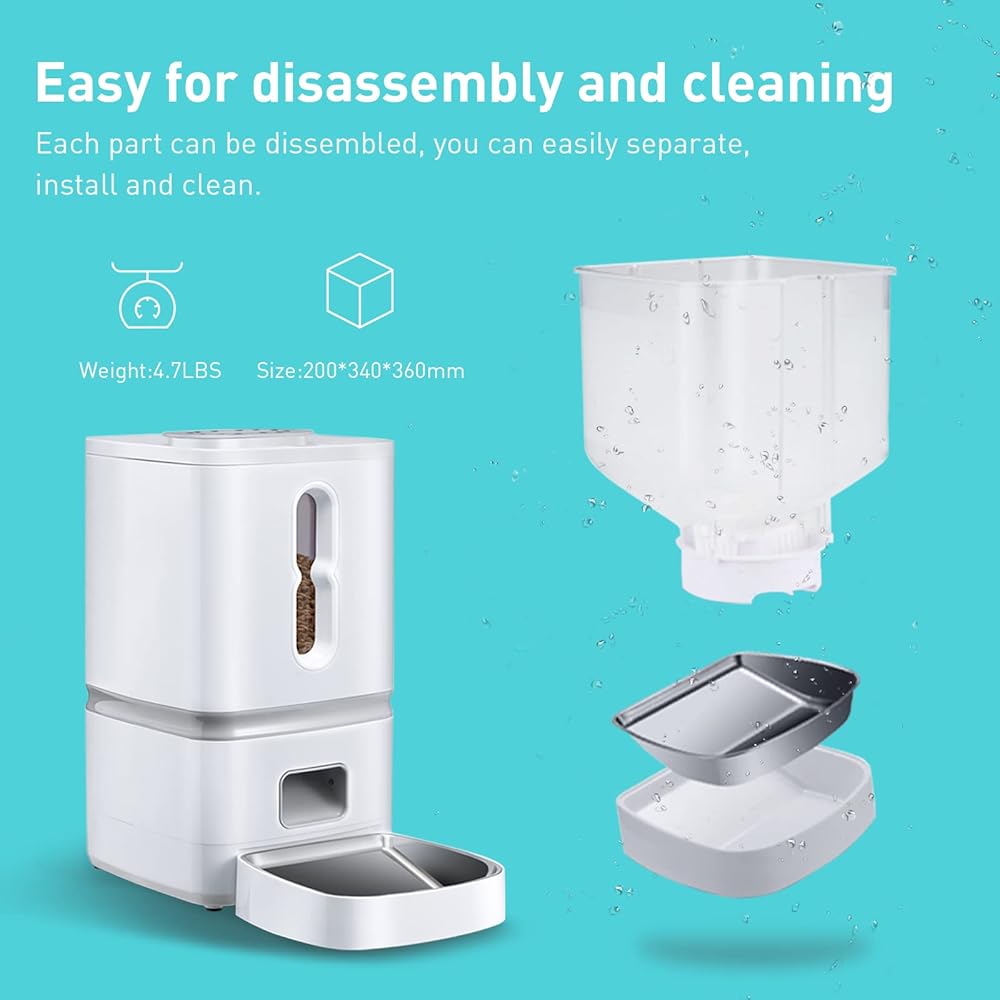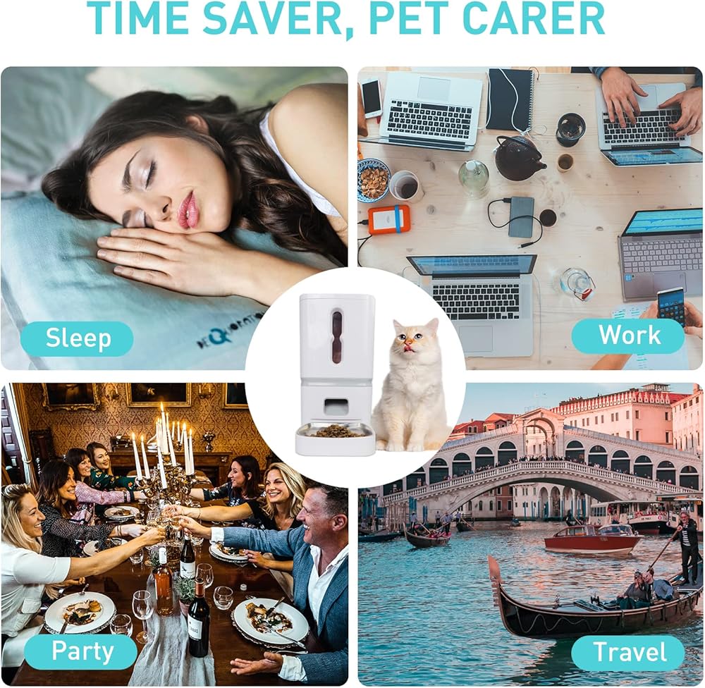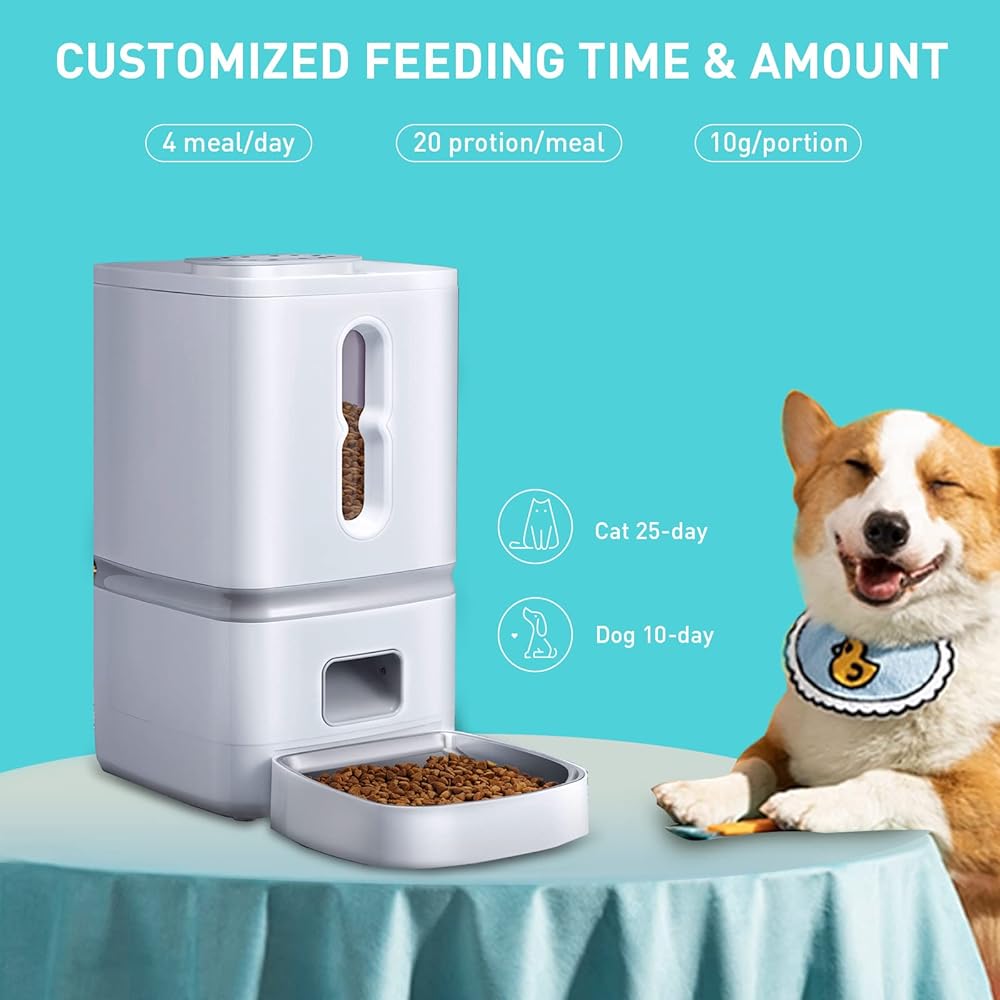 شريك جيد لمحبي الحيوانات الأليفة - سيضمن جهاز تغذية الحيوانات الأليفة التلقائي إطعام حيوانك الأليف في الوقت المحدد حتى عندما تعمل لوقت إضافي، أو في إجازة، أو تنام أو متاحًا بطريقة أخرى. تحمل 7 لتر من طعام الحيوانات الأليفة - 4 وجبات يومية لمدة 40 يومًا للقطط و25 يومًا للكلاب الصغيرة.
