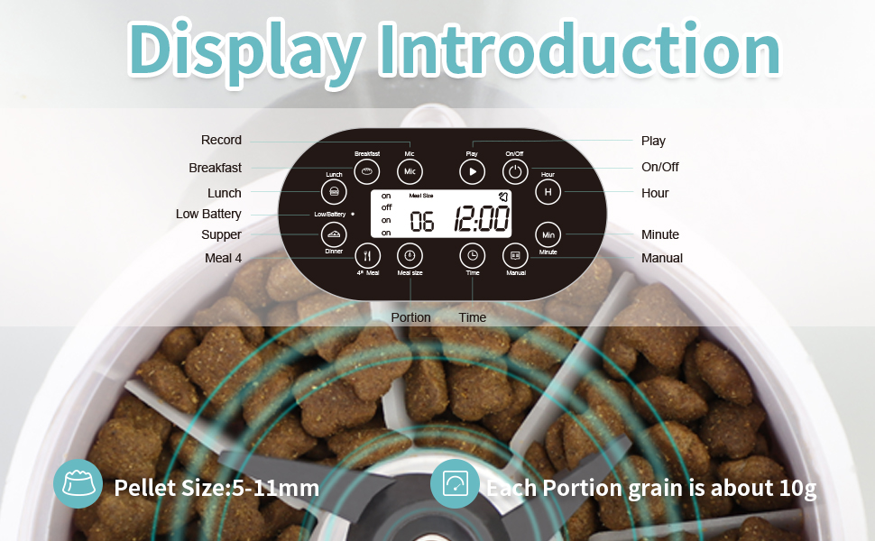 عملية سهلة الاستخدام - شاشة LCD سهلة التشغيل وتعليمات مفصلة تضمن لك إمكانية إعداد وحدة تغذية القطط الموقوتة بسهولة لتلبية احتياجاتك الخاصة. قم بتسجيل رسالة لمدة تصل إلى 10 ثوانٍ للاتصال بحيوانك الأليف لتجعله يشعر بالحب والرعاية في غيابك.