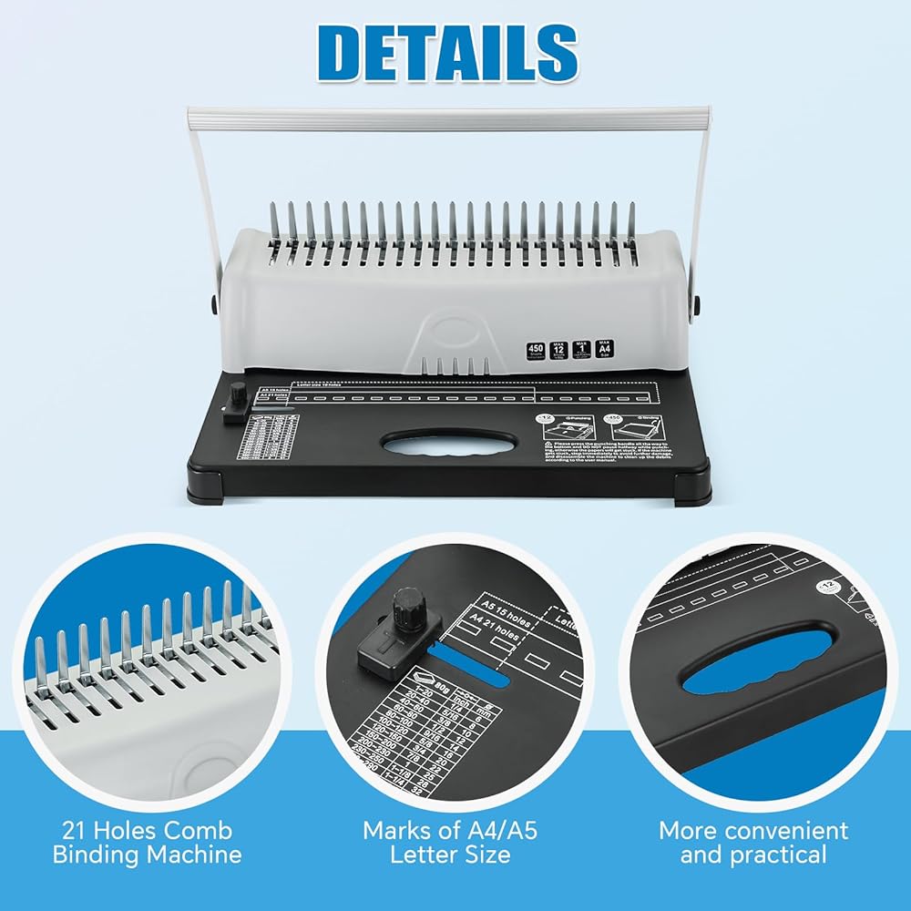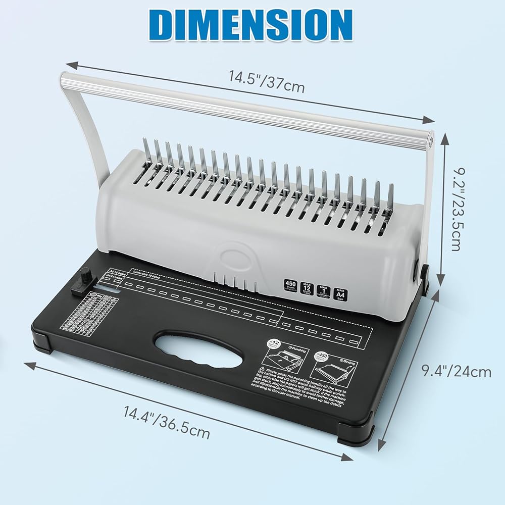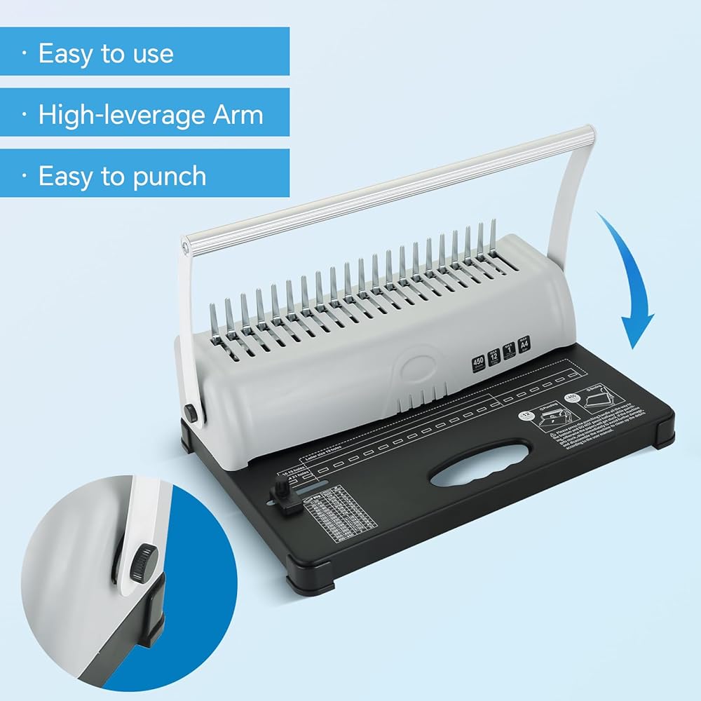 عملية سهلة: الثقب والربط: مع آلة التجليد الخاصة بنا، يكون الأمر بسيطًا مثل الثقب والربط - فقط خطوتين سهلتين. يمكنك بسهولة ثقب ما يصل إلى 15 ورقة في وقت واحد وربط ما يصل إلى 450 ورقة باستخدام أشواك مشط مقاس 3/8 بوصة. يتيح لك ذلك إنشاء كتب مجلدة ذات مظهر احترافي بسرعة ودون عناء، سواء كنت في المنزل أو في المكتب. (ملاحظة: لا يمكن ثقب الورق الرقائقي)