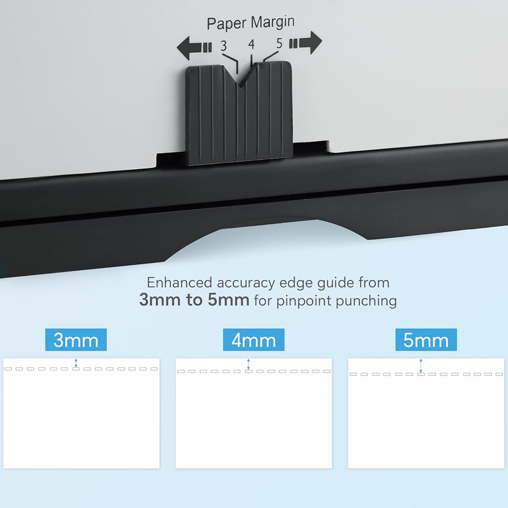 تجليد احترافي وقابل للتخصيص: ماكينة التجليد متوافقة مع ورق بحجم Letter (19 فتحة)، وحجم A4 (21 فتحة)، وحجم A5 (15 فتحة). تضمن هذه الآلة، المزودة بدليل حافة قابل للتعديل، محاذاة دقيقة لكل مستند تقوم بتجليده. بالإضافة إلى ذلك، يمكنك بسهولة تخصيص هامش الورق إلى 3 مم، أو 4 مم، أو 5 مم، مما يضمن نتائج ذات مظهر احترافي في كل مرة.