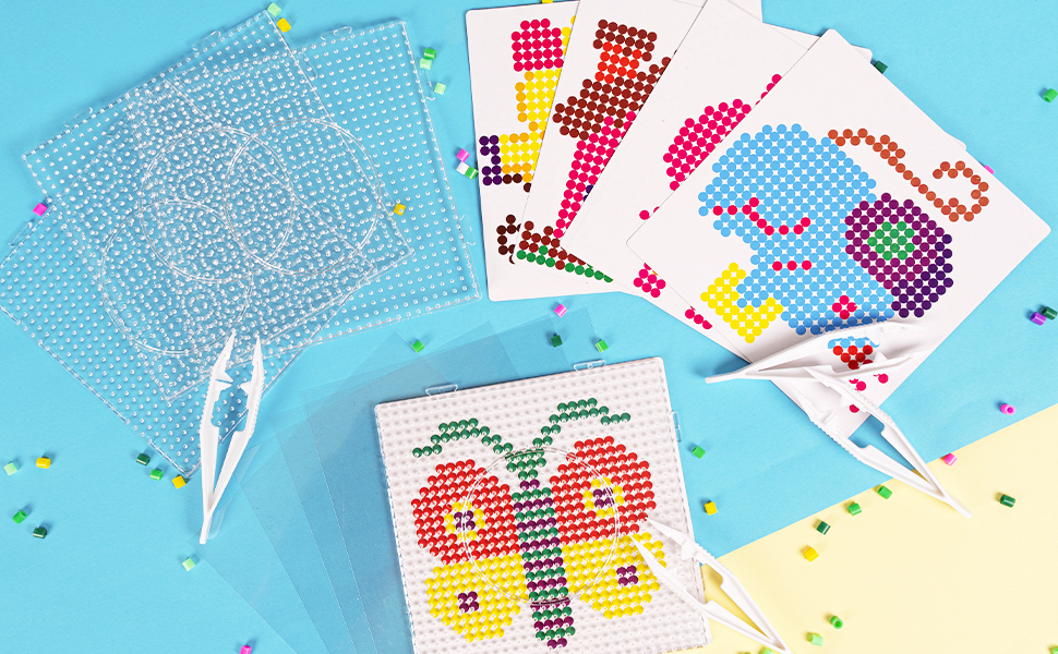 تشمل العبوة: 4 قطع من الألواح الشفافة للخرز، 5 قطع من الأنماط الملونة بما في ذلك المنزل والفراشة والفيل والأرانب والخنزير، و4 أوراق كي، و4 ملاقط، بما يكفي لتلبية احتياجاتك.