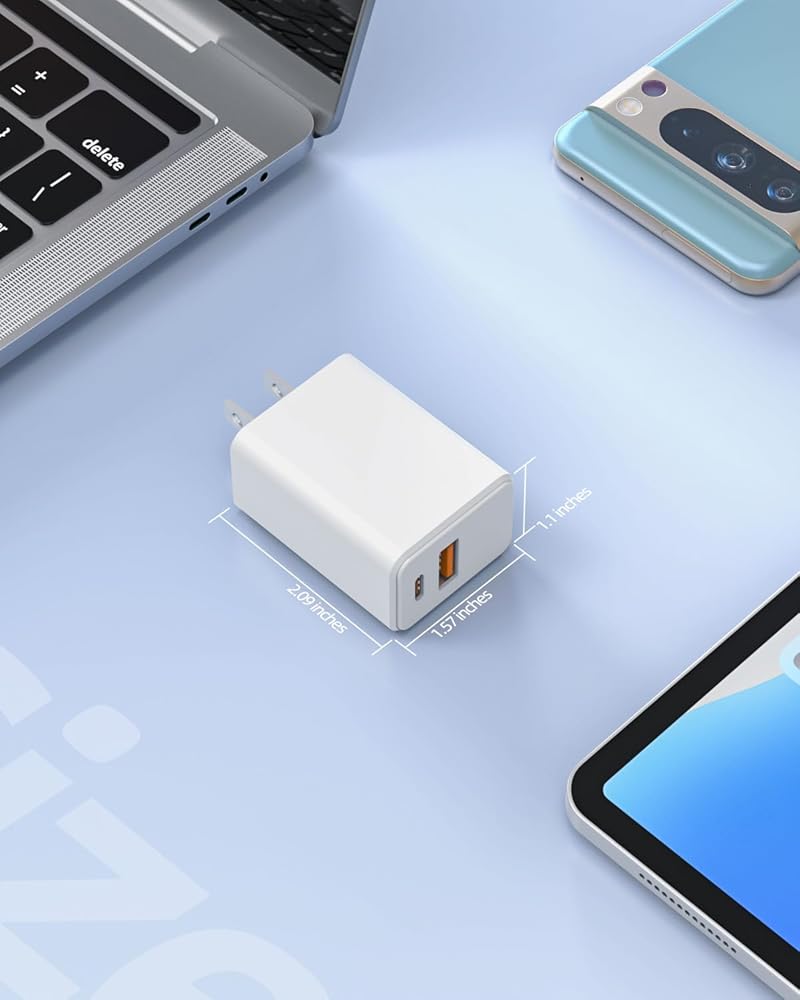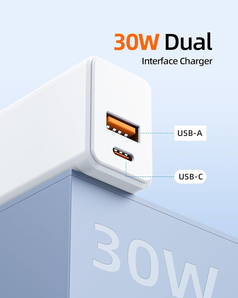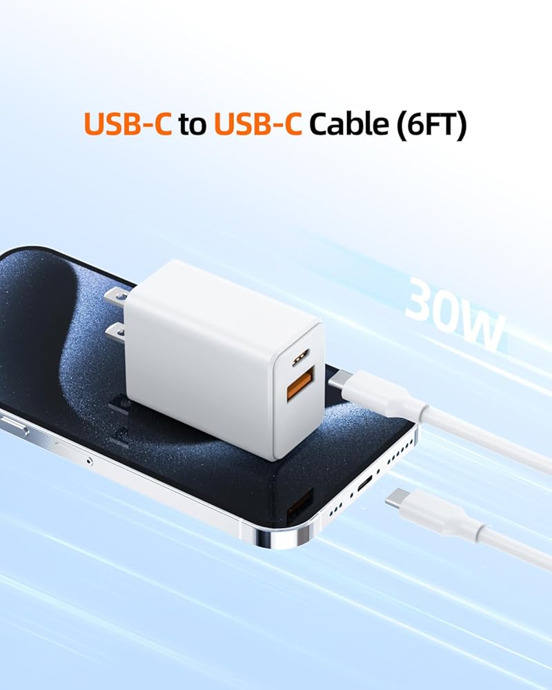 جميع الأجزاء متضمنة: شاحن واحد بقوة 30 واط، وكابل بطول 6 أقدام.