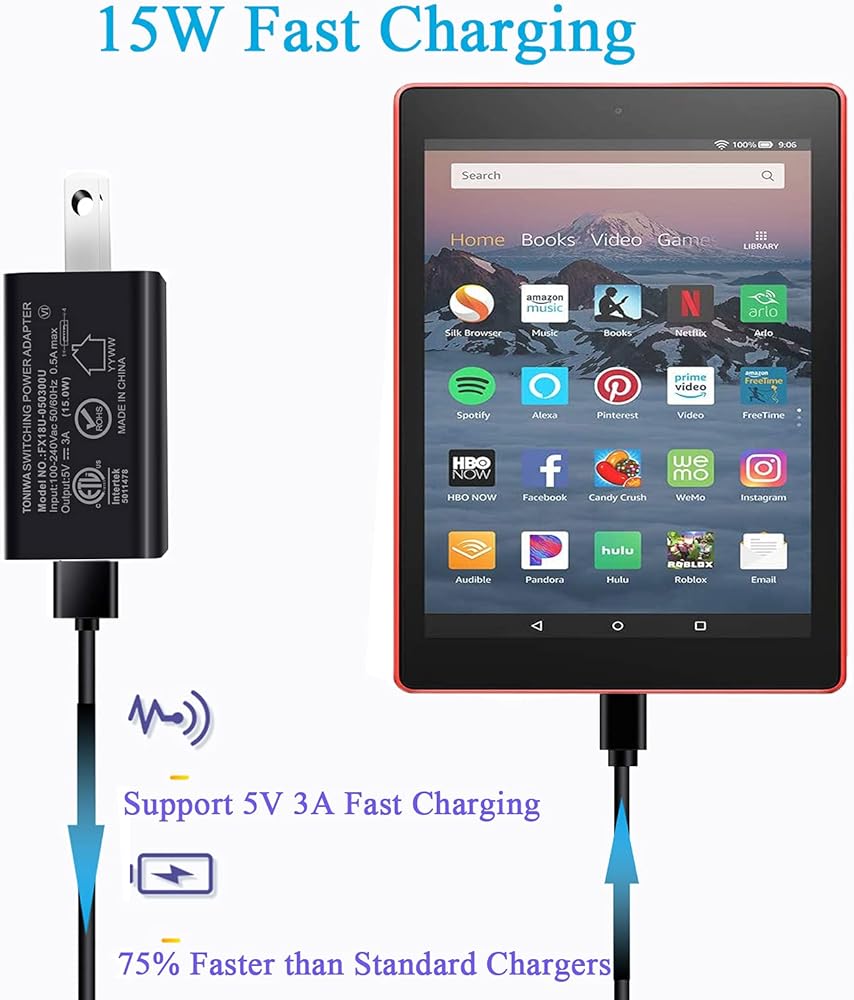 شاحن كمبيوتر لوحي سريع بقدرة 15 وات متوافق مع جهاز Fire HD 7 8 10 Plus/Kids/Kids Pro الجديد كليًا (إصدار 2019-2023)، Fire Max 11، Kindle Paperwhite مع كابل 9FT من النوع C