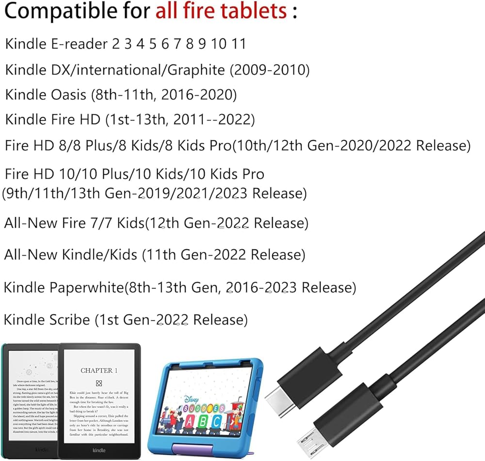 Our fire tablet charger cable with both type C and micro USB ports for all fire hd tablets, all-new fire hd 7 8 10 plus/kids/kids pro, amazon fire max 11th, kindle paperwhite 11th, kindle e-reader 2 3 4 5 6 7 8 9 10 11, kindle oasis, kindle scribe