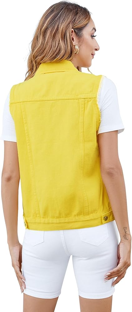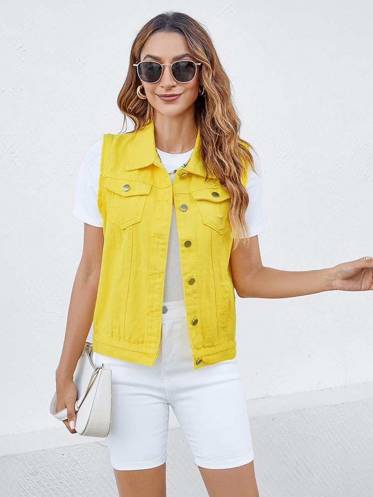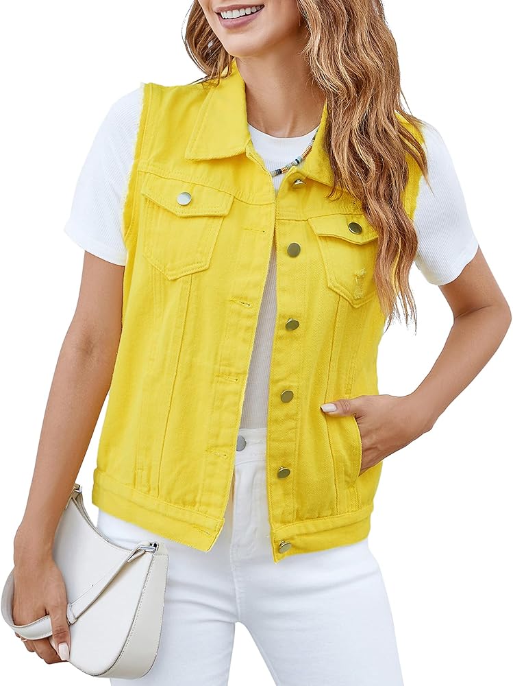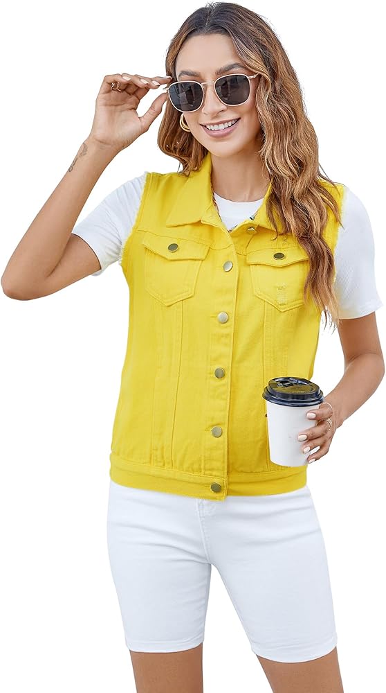 سترة صدرية، إغلاق بأزرار سفلية، جيوب على الصدر بأزرار، جيبان جانبيان، ألوان ثابتة ودنيم ممزق، بدون أكمام.