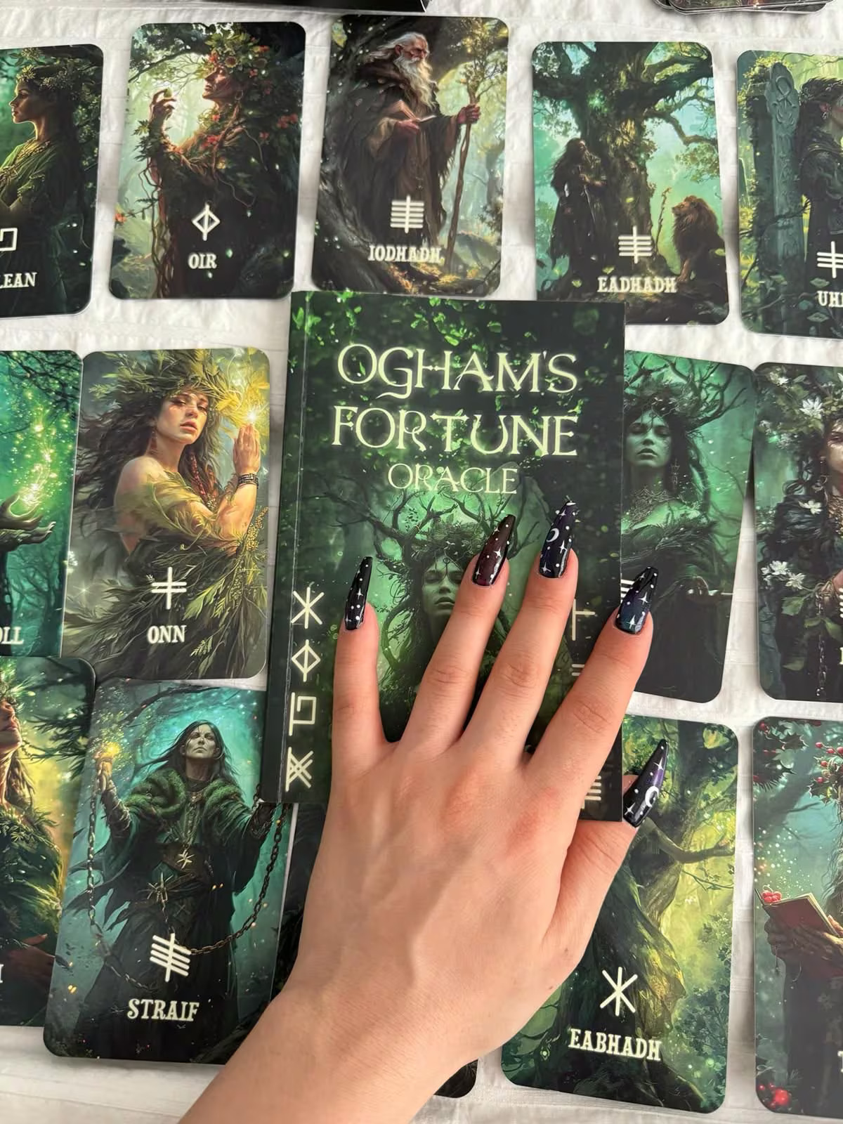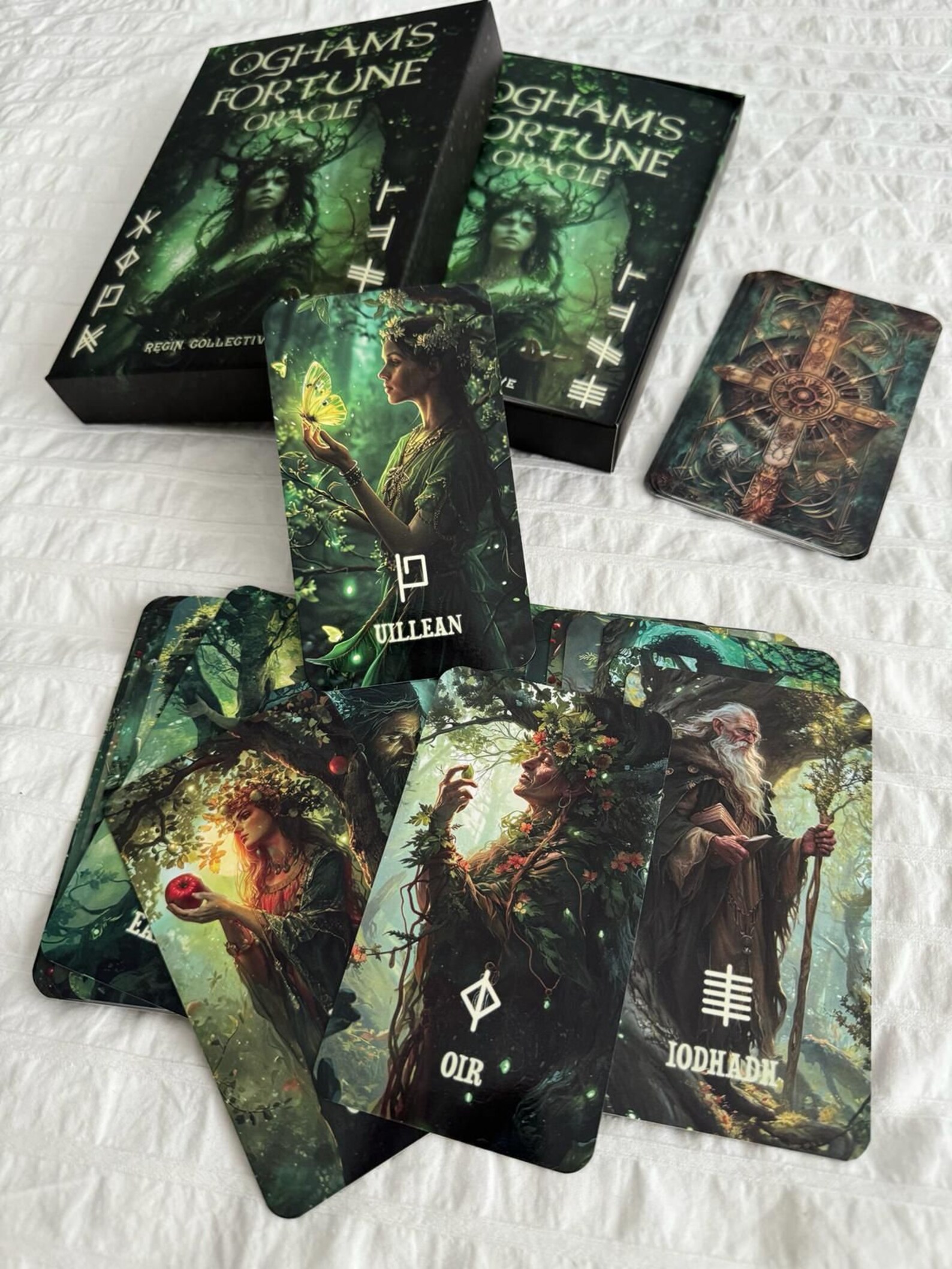 صندوق منقوش - لضمان الحفاظ على بطاقاتك ودليلك في حالة جيدة، يأتي "Ogham's Fortune Oracle" في صندوق مصمم خصيصًا وعالي الجودة. هذه العبوة المخصصة لا تحمي مجموعة أوراكل الخاصة بك فحسب، بل تعمل أيضًا كقطعة عرض جميلة، مما يعكس سحر وأناقة سطح السفينة.