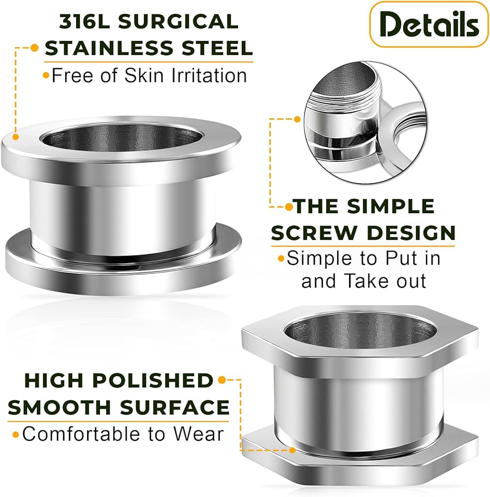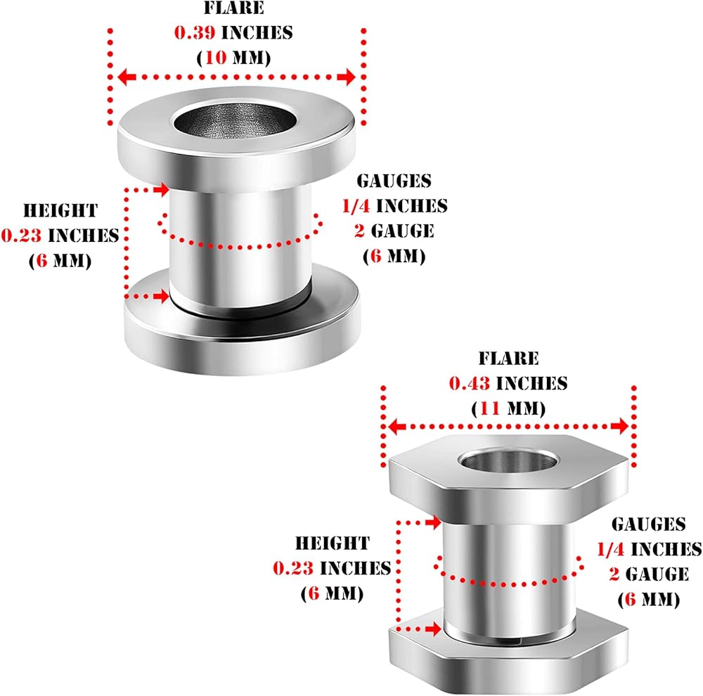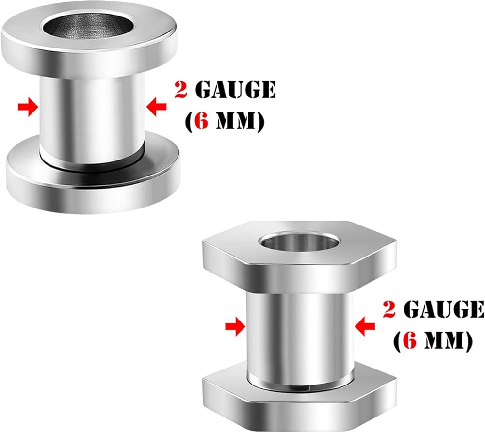 2 Pairs, A pair of 316L Surgical Steel Ear Guage Tunnels (Polished Screw-fit flesh) . A pair of 316L Surgical Steel Tunnels Gauges Ears (Polished Screw-fit flesh in hexagon) . 5 gauge sets choices ;4g (5mm), 2g (6mm), 0g (8mm), 00g (10mm) and 1/2 inch (12mm), please pick one. Items will be packed in a nice bag.