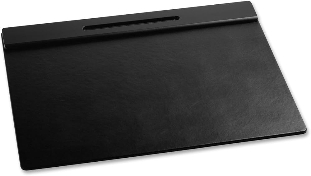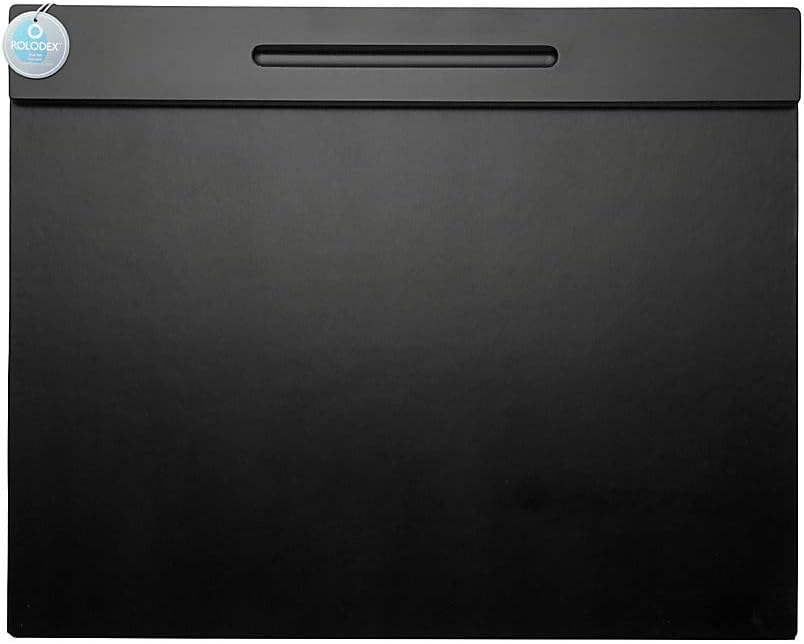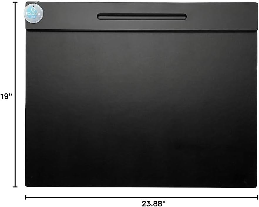 Rolodex Wood Tones Collection Desk Pad, Black (62540). Desk mat offers a 24- by 17 5/8-inch writing surface. Solid wood pencil ledge. The Wood Tones collection combines solid construction with the warmth of a natural wood grain look and softly rounded edges. Felt backing protects desktop surface from scratches. 23.88 inches long by 19 inches wide by 0.7 inches high.