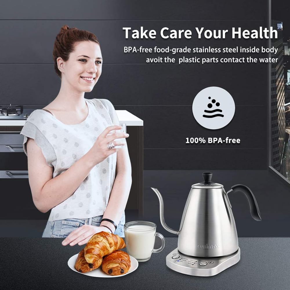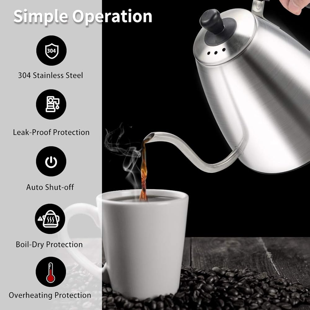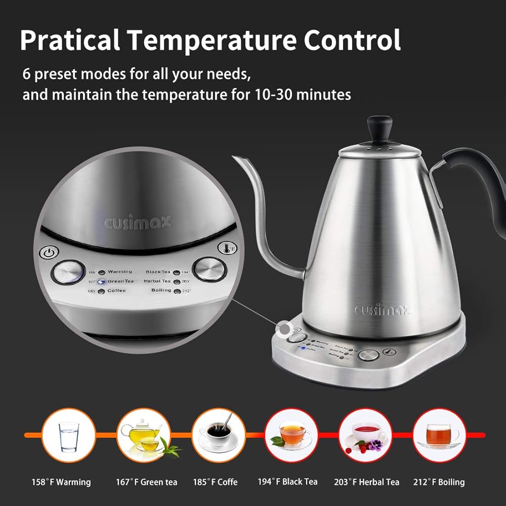 غلاية كيوسيماكس معقوفة، غلاية كهربائية 1000 واط، 1 لتر، غلاية متغيرة مع 6 درجات حرارة تصب للتقطير القهوة والشاي، غلاية من الفولاذ المقاوم للصدأ مع الحفاظ على الدفء التلقائي وحماية الغليان الجاف