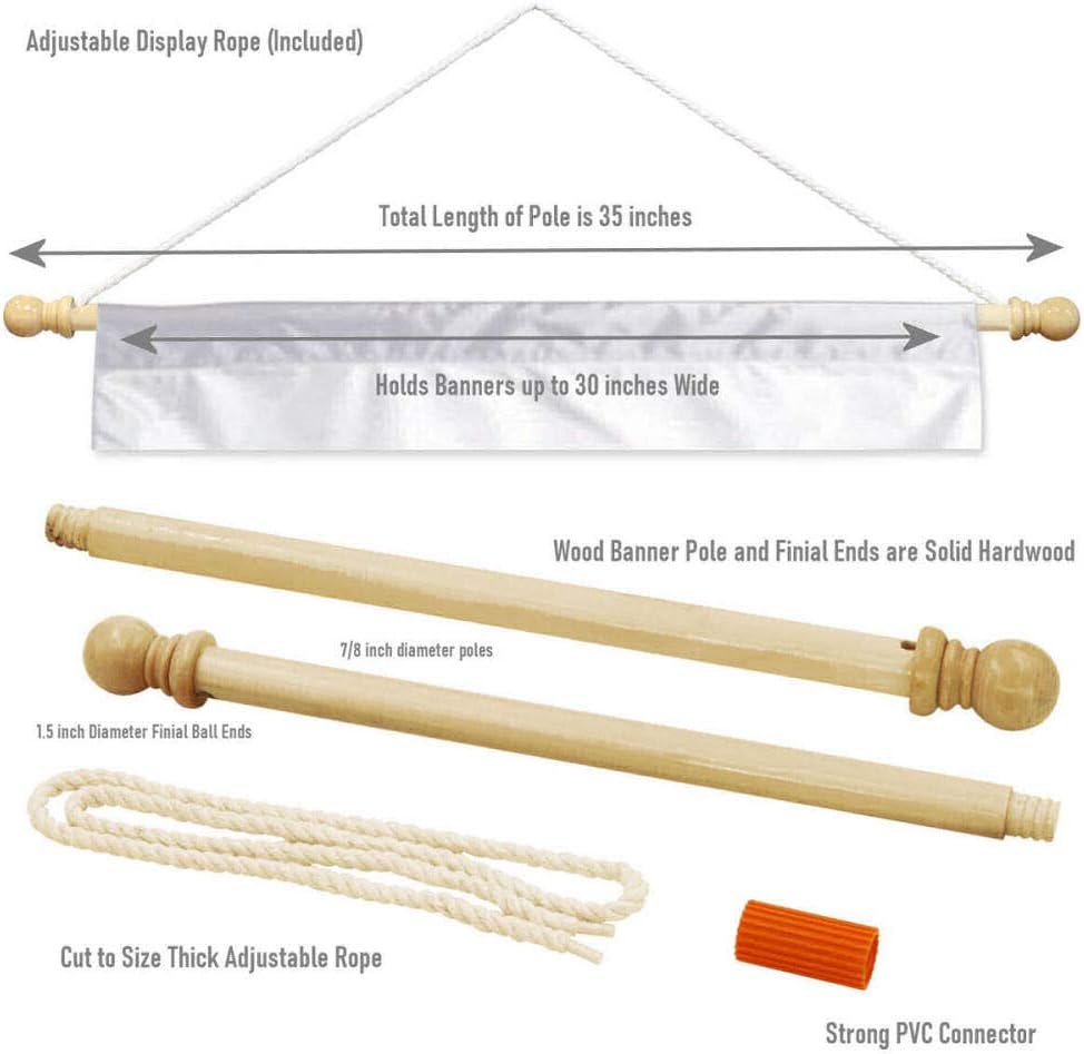 • Includes a 36" wide 3/4" thick Hardwood Banner Pole with heavy white Hanging Rope, Imported