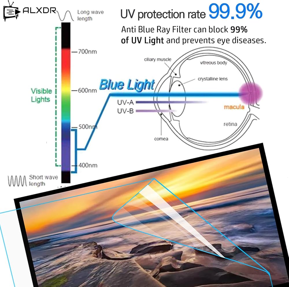 واقي شاشة مضاد للضوء الأزرق للتلفزيون، طبقة تصفية للضوء الأزرق مضادة للخدش/مضادة للأشعة فوق البنفسجية، تخفف من إجهاد عين الكمبيوتر وتساعدك على النوم بشكل أفضل (43 بوصة ~ 942 * 529 مم)