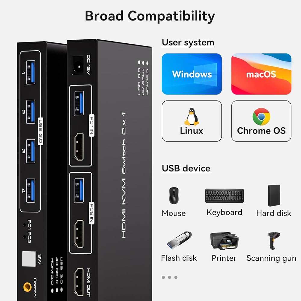 【4K KVM Switcher HDMI】يدعم مفتاح KVM HDMI دقة تصل إلى 4K@60 هرتز، مما يسمح بعرض الصور بشكل أكثر جمالاً وواقعية، وستكون الألوان أكثر حيوية وديناميكية. إذا كنت ترغب في تحقيق أعلى تأثير، يرجى التأكد من أن كل من جهاز الإدخال وكابل HDMI وجهاز الإخراج يدعم 4K@60 هرتز.