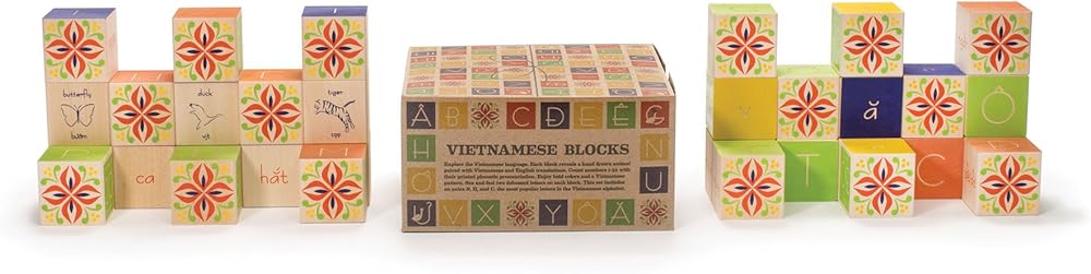 Enjoy the bold color and pattern. Each block reveals a hand drawn animal paired with Vietnamese and English translations. Count numbers 1-32 with their printed phonetic pronunciation. Two debossed letters per block.