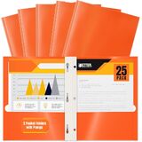 حزمة كبيرة: 25 حزمة من المجلدات الورقية ذات اللون البرتقالي اللامع مع شوكات معدنية لورق/مستندات مثقوبة بثلاث فتحات مقاس 8.5 بوصة × 11 بوصة؛ صندوق أبيض متضمن