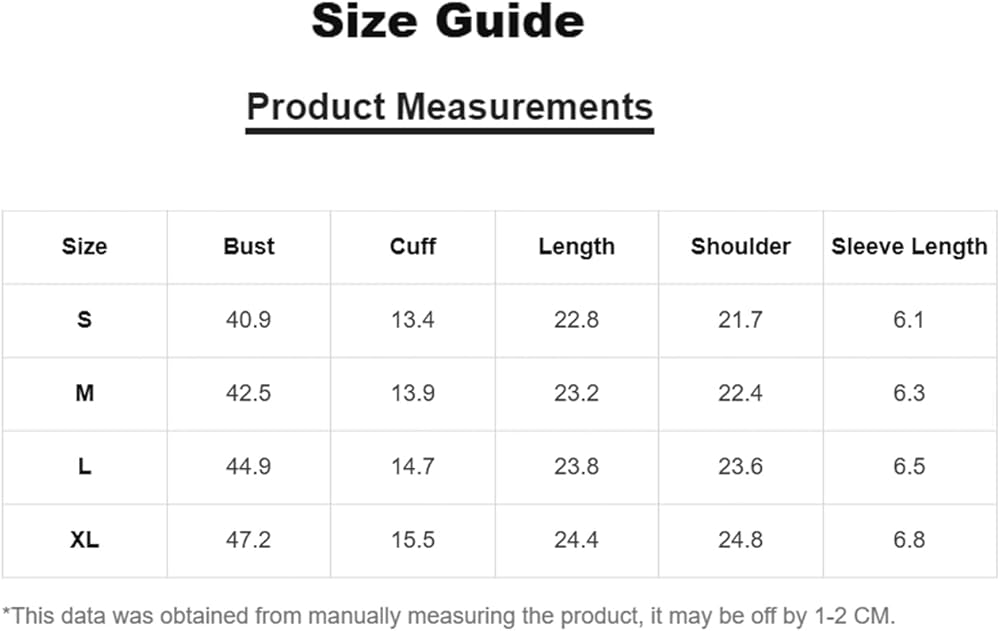 X-Large: Bust: 47.2", Cuff: 15.5", Length: 24.4", Shoulder: 24.8", Sleeve Length: 6.8"