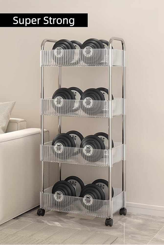 VERSATILE STORAGE: This clear acrylic storage cart with stainless steel frame offers versatile storage for kitchen, bathroom, laundry room or other areas. Four smooth-rolling wheels provide easy mobility.