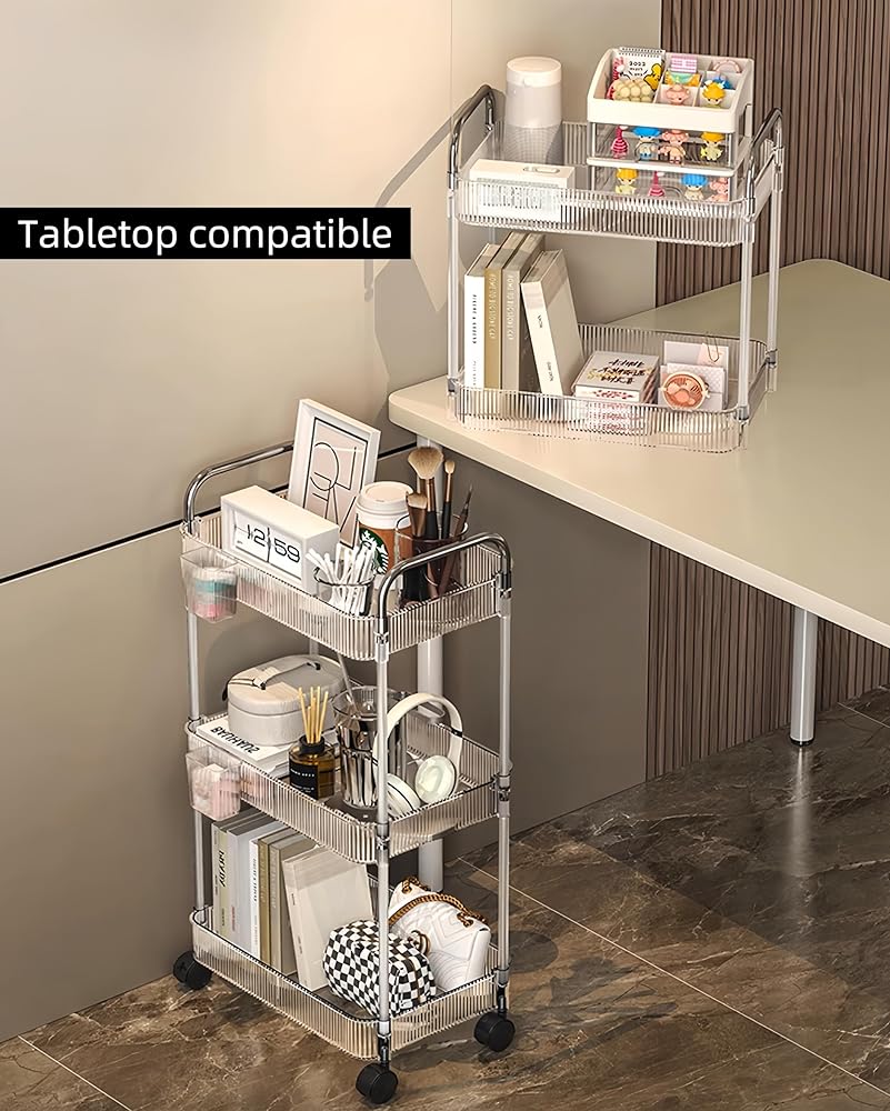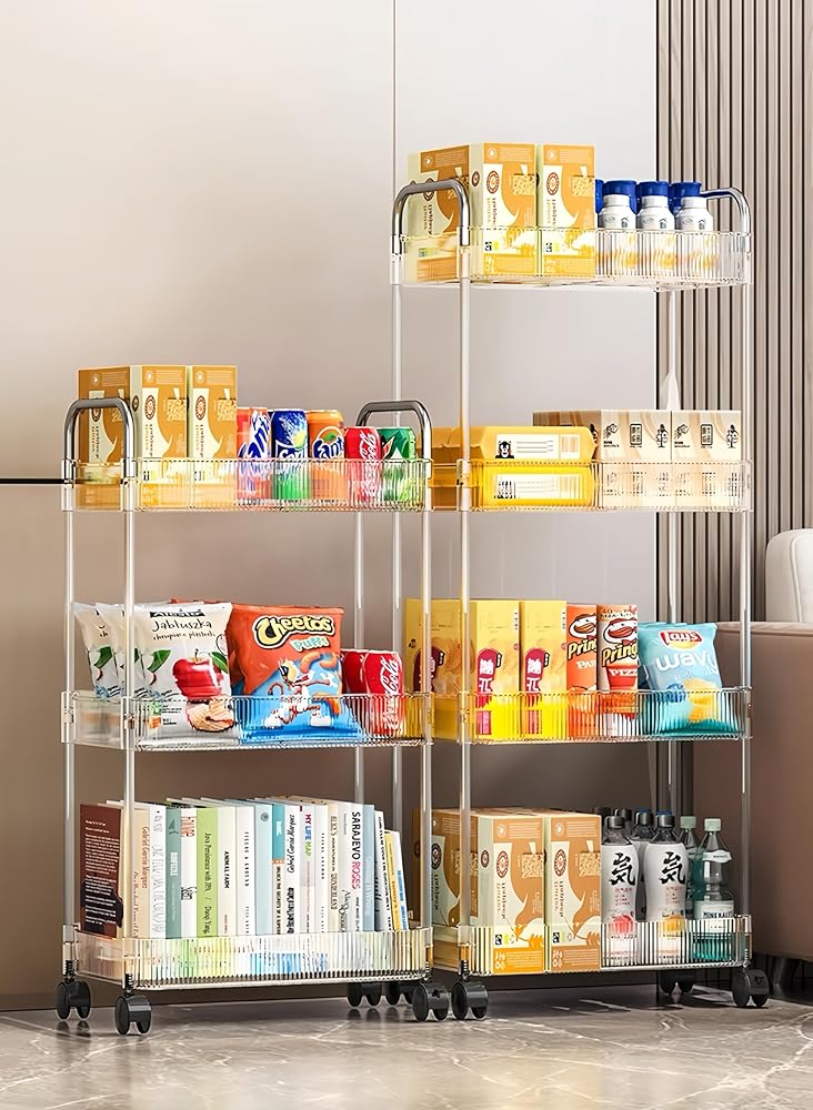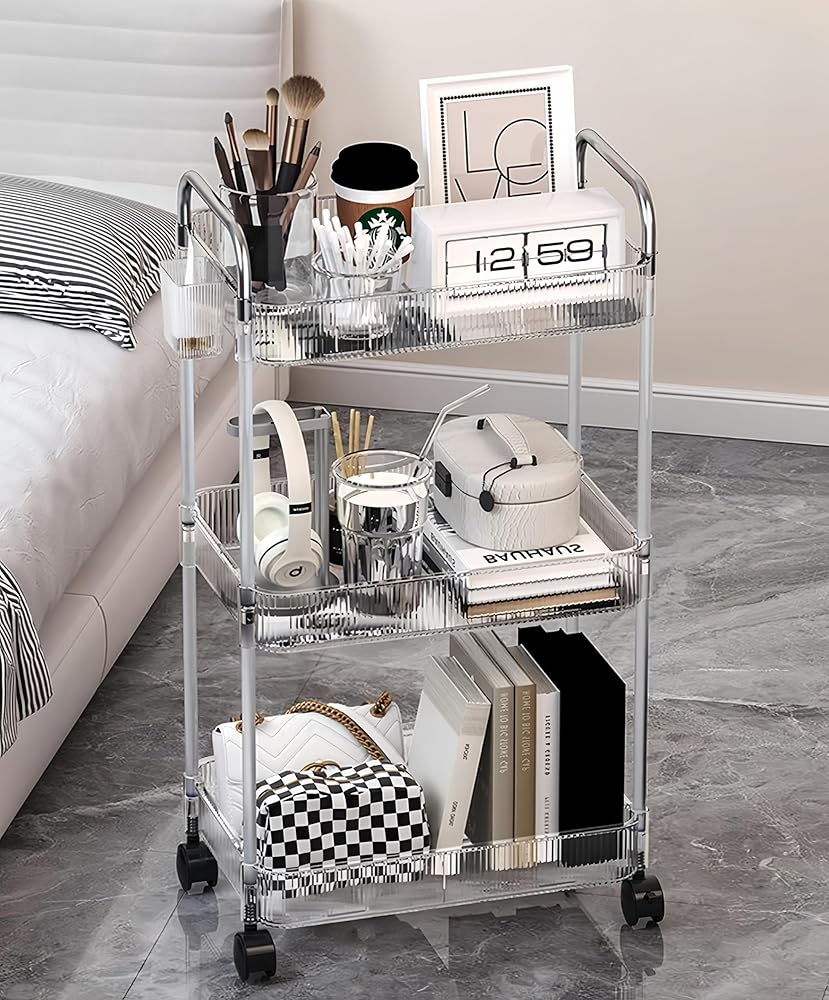 This durable storage cart features a three-tier acrylic design for easy viewing and access. Crafted from transparent acrylic and stainless steel frames, it provides ample open storage space. Four smoothly rolling wheels allow effortless mobility no matter where you need it, making it highly versatile for any room in the home. Whether organizing cosmetics in the bathroom, toys in the bedroom or supplies in the garage, this cart keeps your belongings neatly stored and organized while allowing easy transport throughout your space. Its simple yet sturdy construction means quick assembly and years of dependable use.