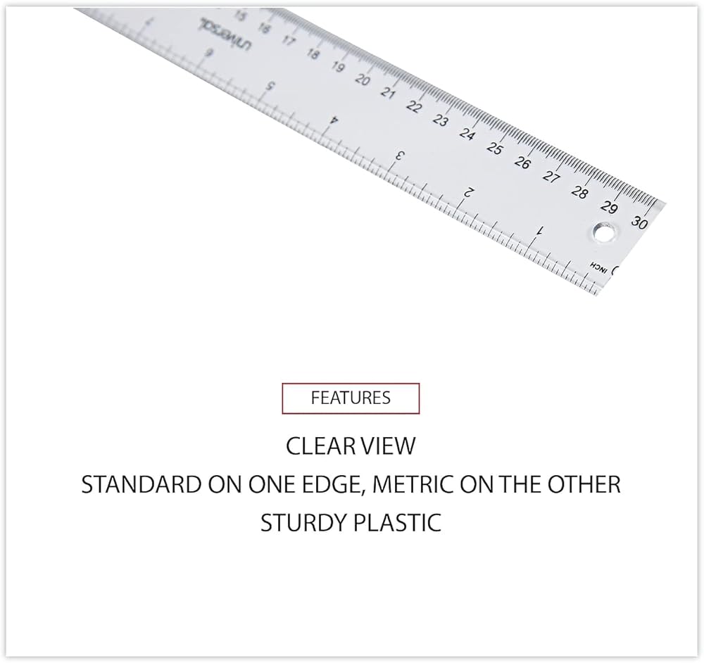 Clear, see-through ruler offers a crystal-clear view of documents while measuring and marking. Contains a standard scale on one edge and metric on the other for the ultimate in versatility. Durable and sturdy construction to ensure it lasts a long time. A valuable tool in the home, classroom, office, warehouse, store, or at the job site. Sturdy plastic for continued use.