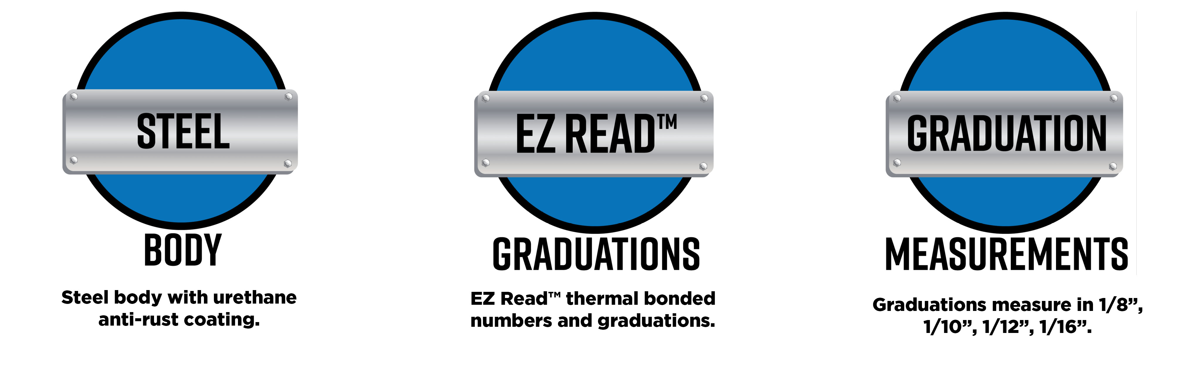 التخرج: يحتوي مقياس القياس هذا على تدرجات وأرقام سهلة القراءة 1/8 بوصة مرتبطة حراريًا بتقنية EZ Read. مثالية لوضع وتحديد الأنماط في الأسقف والتأطير وأعمال السلالم وما إلى ذلك.