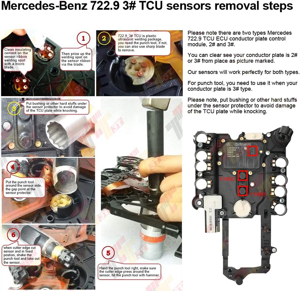 Please note there are two types Mercedes 722.9 TCU ECU conductor plate control module, #2 and #3. You can clear see your conductor plate is #2 or #3 from place as picture marked.