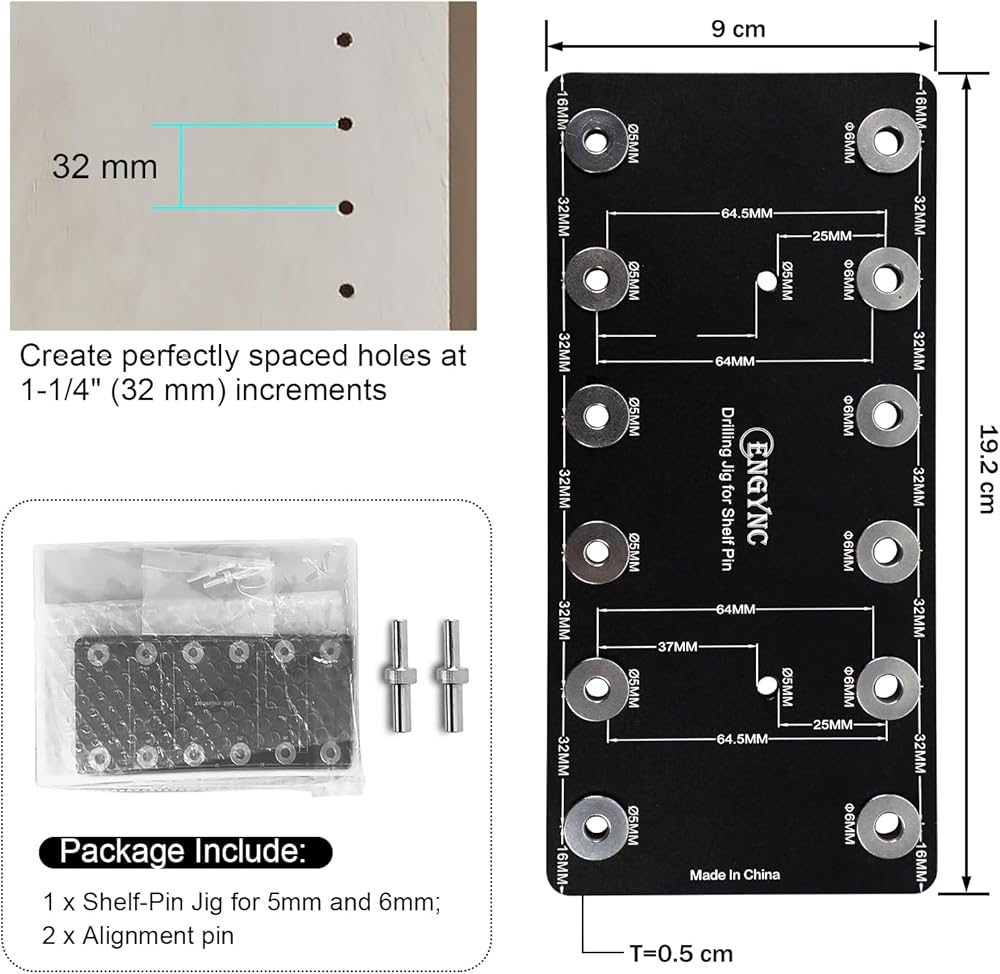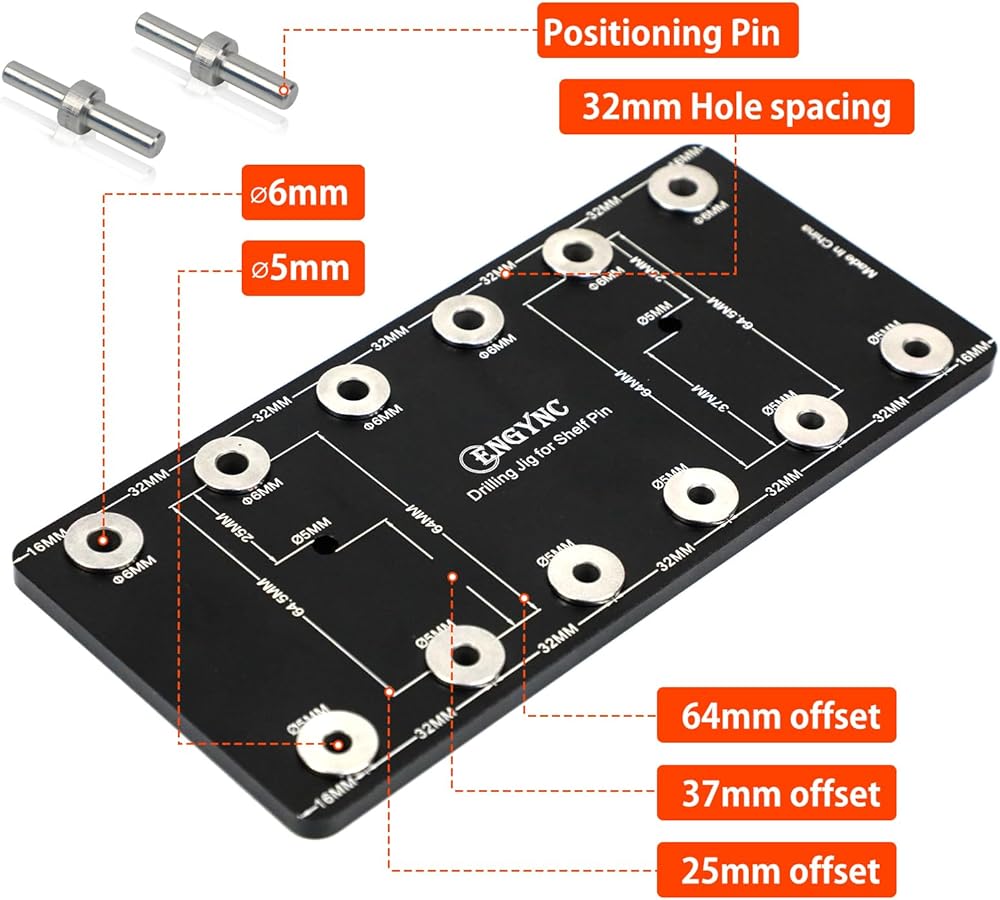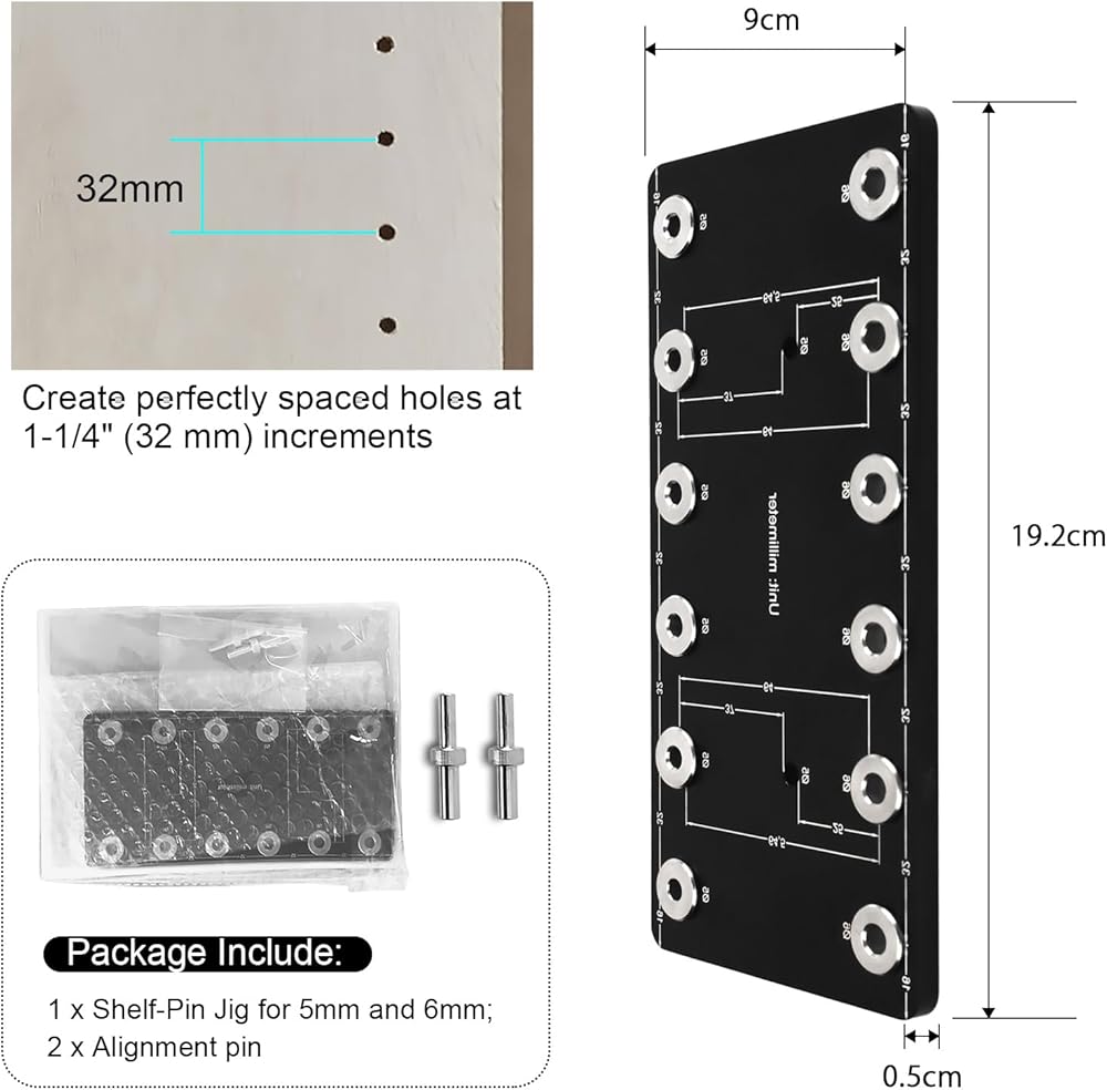2. Work for Both 5mm and 6mm holes on 32mm centers: It can drill 6pcs precise 5mm or 6pcs precise 6mm straight holes one time according you need.Require bits to create 6mm and 5mm holes according you choose.Fit Pin Jig 5mm / Pin Jig 6mm.