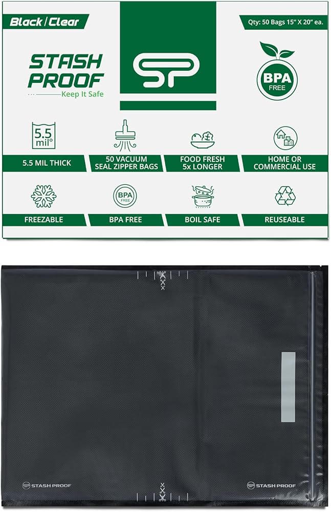 أكياس إغلاق مفرغة بسحاب مقاس 38.1 سم × 50.8 سم (50 قطعة) 5.5 مل (أسود وشفاف) - حافظة طعام من الدرجة التجارية خالية من مادة BPA للتخزين، وفيديو Sous Vide، وحقيبة إغلاق لإعداد الوجبات