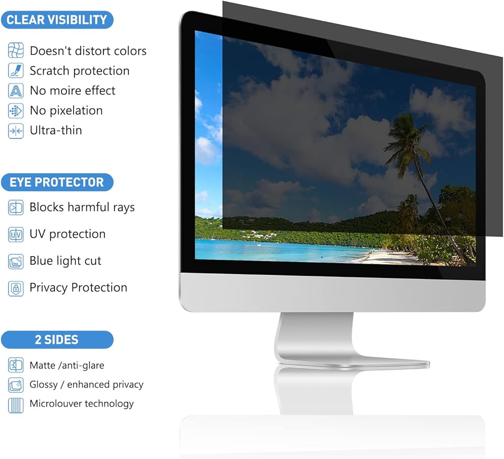 ✅【Eye Protector with Double Glossy and Matte Finsh】16 privacy screen for monitor protects your eyes by filtering out 96% UV and curbing blue light by 65%. It's a reversible privacy screen filter, giving you the flexibility to choose glossy or matte finish – Choose the matte to reduce external glare.
