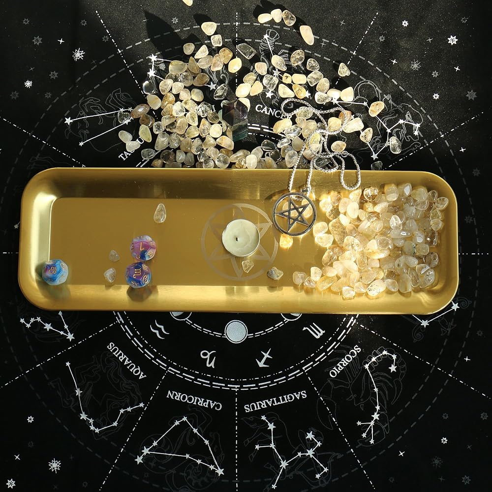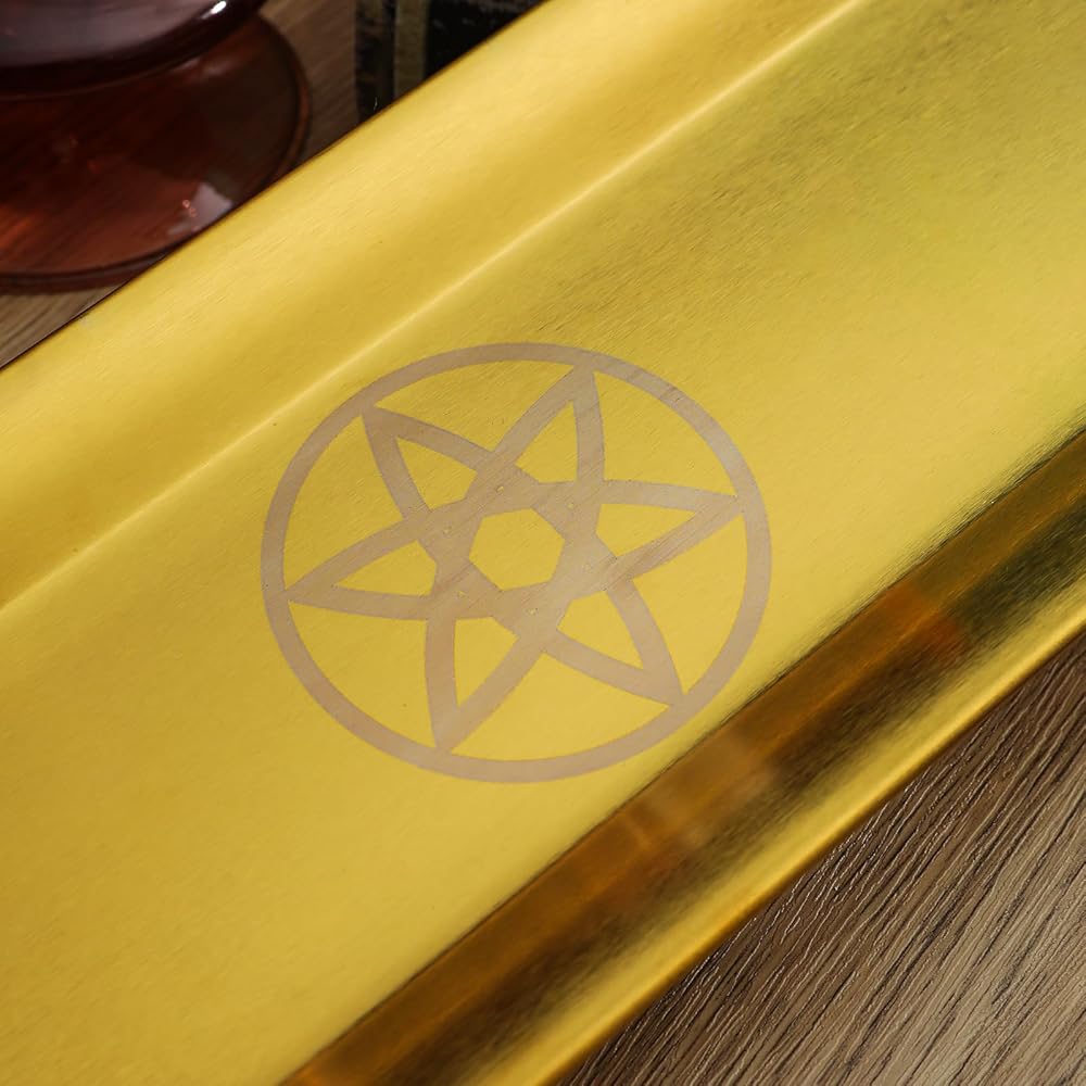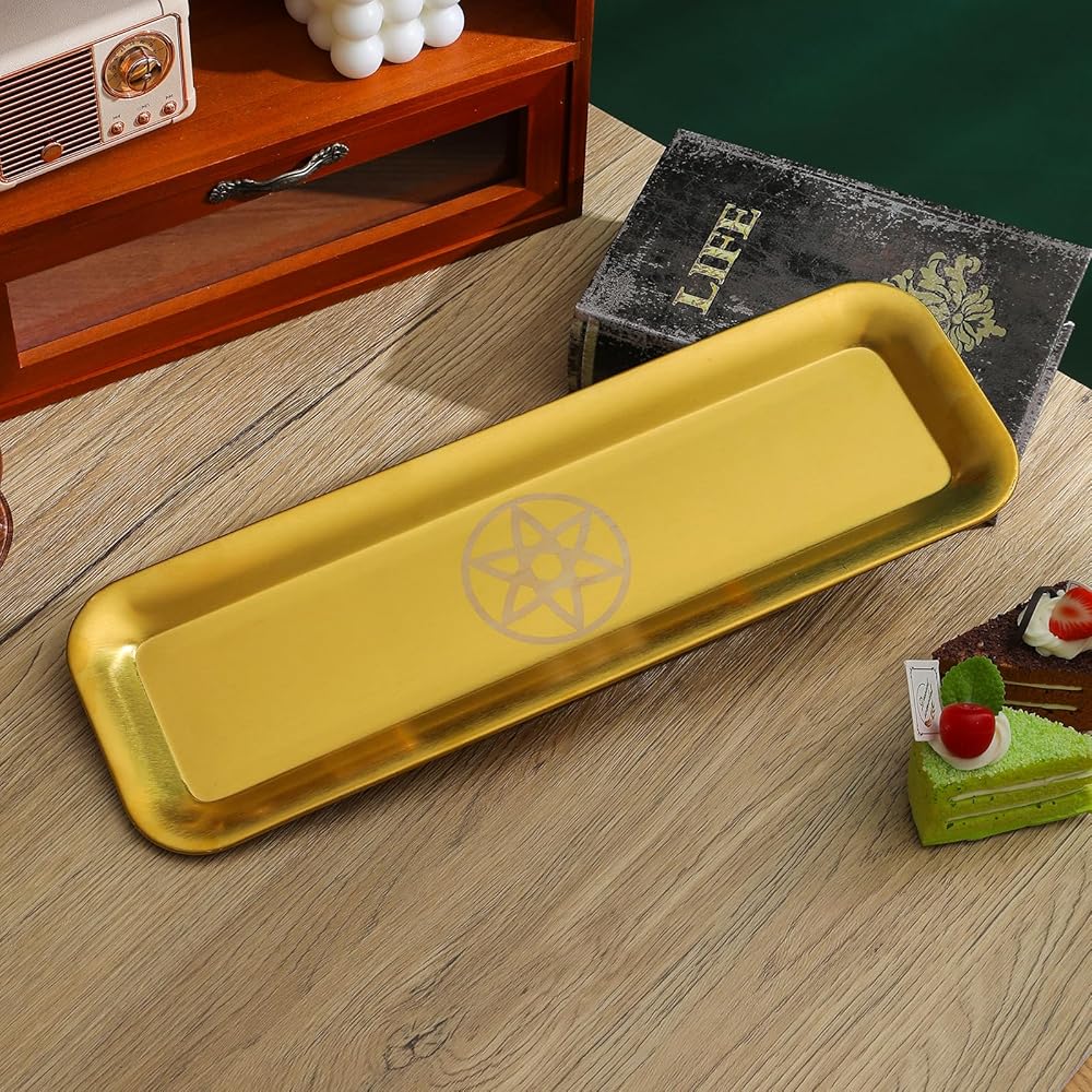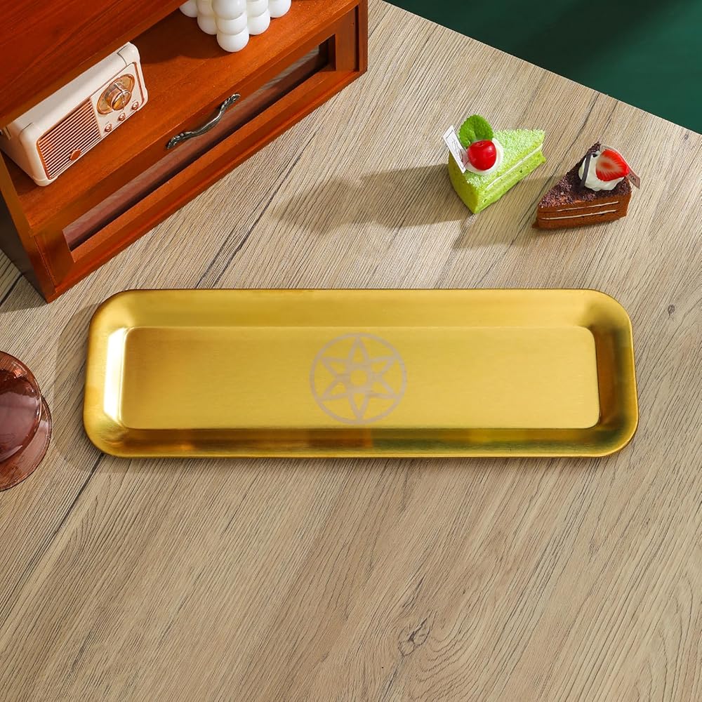 This stainless steel flat-bottomed bowl-style gold decorative plate is a versatile work of art. Its unique design blends classical and modern elements, adding a touch of sophistication and mystique to any occasion. Whether used as a prop for altar rituals, a jewelry tray, a food and fruit platter, a snack plate, or even a smudging decoration plate, it showcases its versatility. The gold stainless steel material of this flat-bottomed bowl imparts it with an elegant appearance, while also providing durability and corrosion resistance, ensuring its longevity. Its spacious surface can accommodate various items, whether it's jewelry, rings, or small ornaments, all of which can be displayed tastefully on this decorative plate. Additionally, it's suitable for ceremonies or celebratory events, elevating the overall ambiance with a sense of ceremony and grandeur. Moreover, this multi-functional flat-bottomed bowl can also be used in daily life as a container for displaying fruits, snacks, or other delicacies. Its flat and stable bottom ensures reliability even when holding moist foods, alleviating concerns about leakage. Furthermore, its unique design makes it an exquisite decorative piece, perfect for placement on desks, cabinets, or display shelves, adding a touch of artistic flair and individual style to any space. In conclusion, this stainless steel flat-bottomed bowl-style gold decorative plate, with its versatility and exquisite design, brings forth endless possibilities for various settings. Whether utilized as a ritual prop, a jewelry tray, a food platter, or a decorative item, it exudes a unique charm that enhances the aesthetics and enchantment of your life and living space.