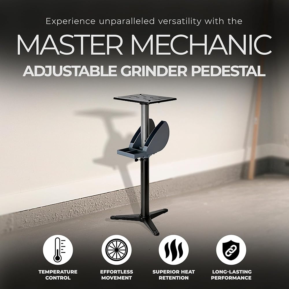 Discover the Master Mechanic Adjustable Grinder Pedestal, a powerhouse addition to your workshop setup. Engineered with premium materials and built for enduring strength, this pedestal features a sturdy cast iron base that provides unwavering stability for all your grinding endeavors. Experience unparalleled versatility with the adjustable design of this pedestal, allowing you to tailor the height to your exact specifications. Whether you're working on large-scale projects or intricate detail work, this pedestal ensures optimal ergonomics and comfort, minimizing fatigue and maximizing productivity. Keep your essential grinding tools organized and easily accessible with the convenient tool holder integrated into this pedestal. Say goodbye to the frustration of searching for equipment mid-task; everything you need is at your fingertips, streamlining your workflow for seamless efficiency. The built-in grinding wheel holder securely grips your wheels, enhancing security and efficiency and eliminating wobbling and instability during use. Upgrade your workshop with the Master Mechanic Adjustable Grinder Pedestal and revolutionize your grinding operations. Precision, stability, and convenience converge in this indispensable tool, empowering you to tackle any task with confidence and ease. Promote your craftsmanship with the superior performance of this top-tier grinder pedestal.