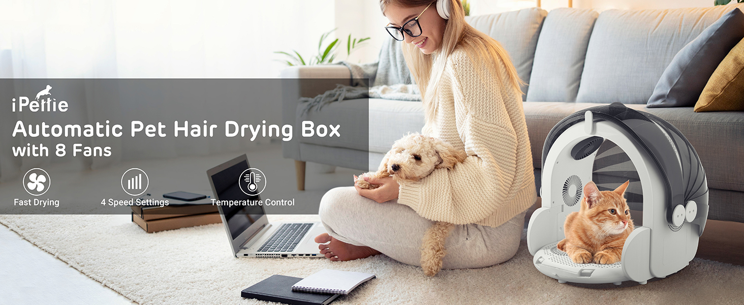 صندوق مجفف تلقائي للحيوانات الأليفة من iPettie، صندوق مجفف للقطط مع ثمانية مراوح عالية السرعة، تدفق هواء 360 درجة، التحكم في درجة الحرارة، إعدادات 4 سرعات ومؤقت، آلة صندوق تجفيف الحيوانات الأليفة فائقة الهدوء للكلاب الصغيرة، 60 لتر