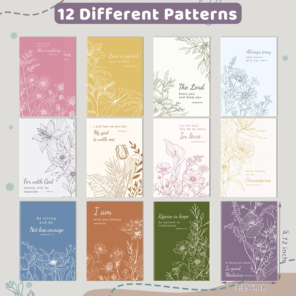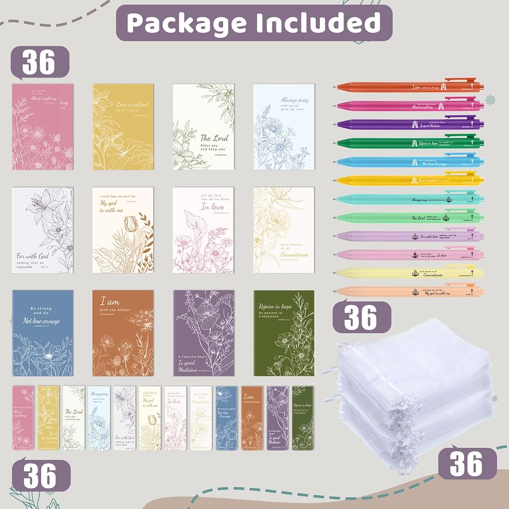 ✞【كمية كافية】تتضمن المجموعة 36 دفترًا صغيرًا بآيات الكتاب المقدس، و36 قلمًا بآيات الكتاب المقدس، و36 علامة مرجعية لآيات الكتاب المقدس، و12 نمطًا مختلفًا لكل منها. نوفر لك أيضًا 36 كيس أورجانزا للتغليف، والتي يمكن أن تلبي متطلبات التخزين والمشاركة.