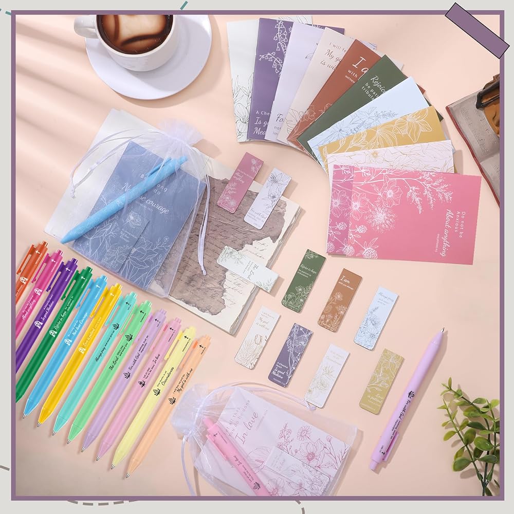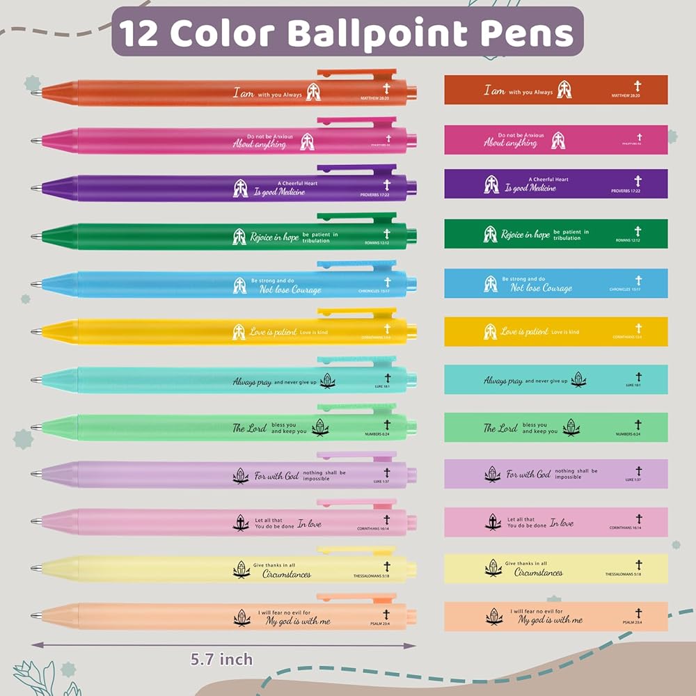✞【تصميم مرئي】تأتي الأقلام بـ 12 لونًا وآيات مختلفة من الكتاب المقدس لتمنحك المزيد من الخيارات. يحتوي دفتر الملاحظات والإشارات المرجعية على 12 عبارة مختلفة من الكتاب المقدس والتي تعتبر هدية جيدة مع عبوة القلم.