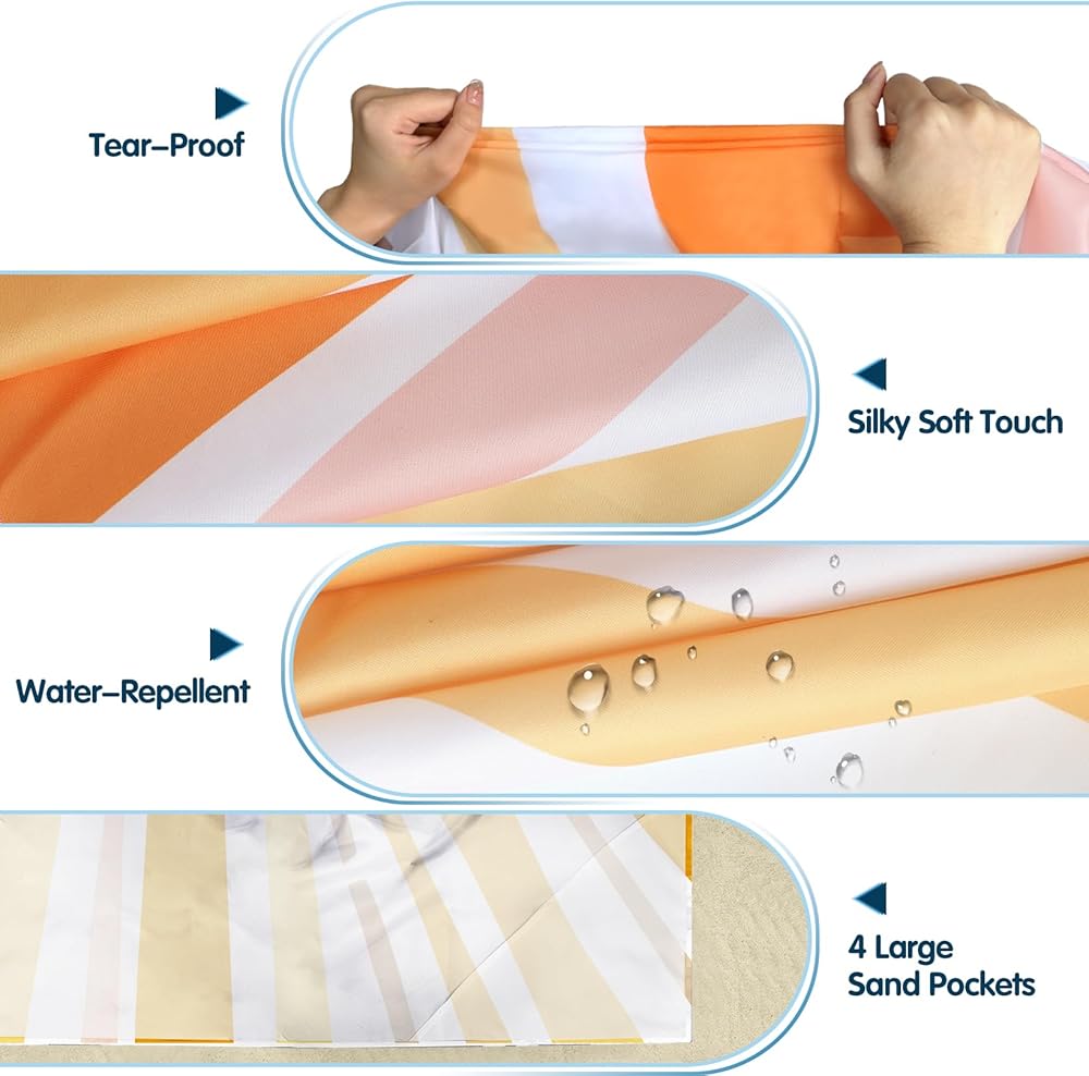 [مادة أفضل، صديقة للبشرة] - بطانية الشاطئ الخاصة بنا مصنوعة من نسيج ناعم رائع تضمن الاسترخاء المريح دون تهيج الجلد. سهلة التنظيف، ببساطة قم بإزالة الرمال دون عناء! مصنوع من أقمشة مقاومة للرمل والماء وعديمة الرائحة، مما يلغي الحاجة إلى التجفيف بعد زيارة الشاطئ.
