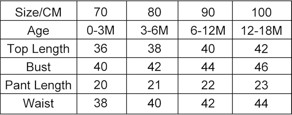 100 Tops Length: 16.93 Bust: 20.47 Pants Length: 8.66 Waist: 16.54 Advised Age: 12-18 Months