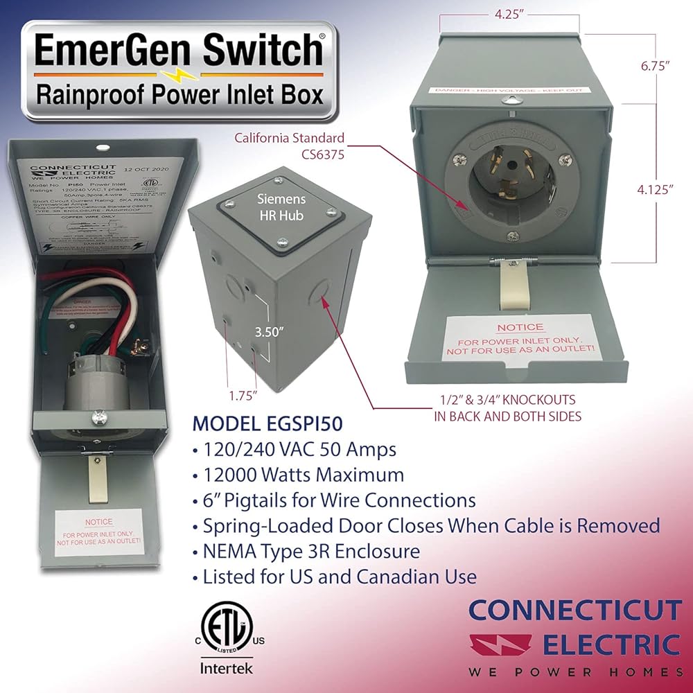 علبة مدخل طاقة مولد كهرباء 50 أمبير مقاوم للمطر مع غطاء. للاستخدام مع مفاتيح نقل التبديل من إيمرجين وأوعية مولد متوافقة. صندوق مدخل طاقة مولد مقاوم للمطر مع غطاء. مكتملة مع وعاء مدخل مشف بالأسلاك. يقبل محاور القناة من سلسلة سيمنز إتش آر مدرج وفقًا لمتطلبات UL-1008. هيكل فولاذي بالكامل. Califirnia Standard CS6375، مدخل 50 أمبير