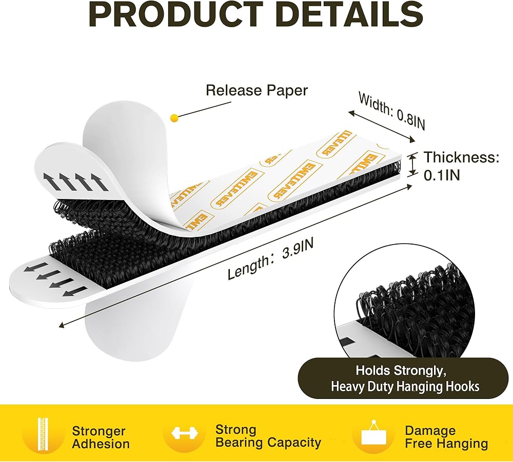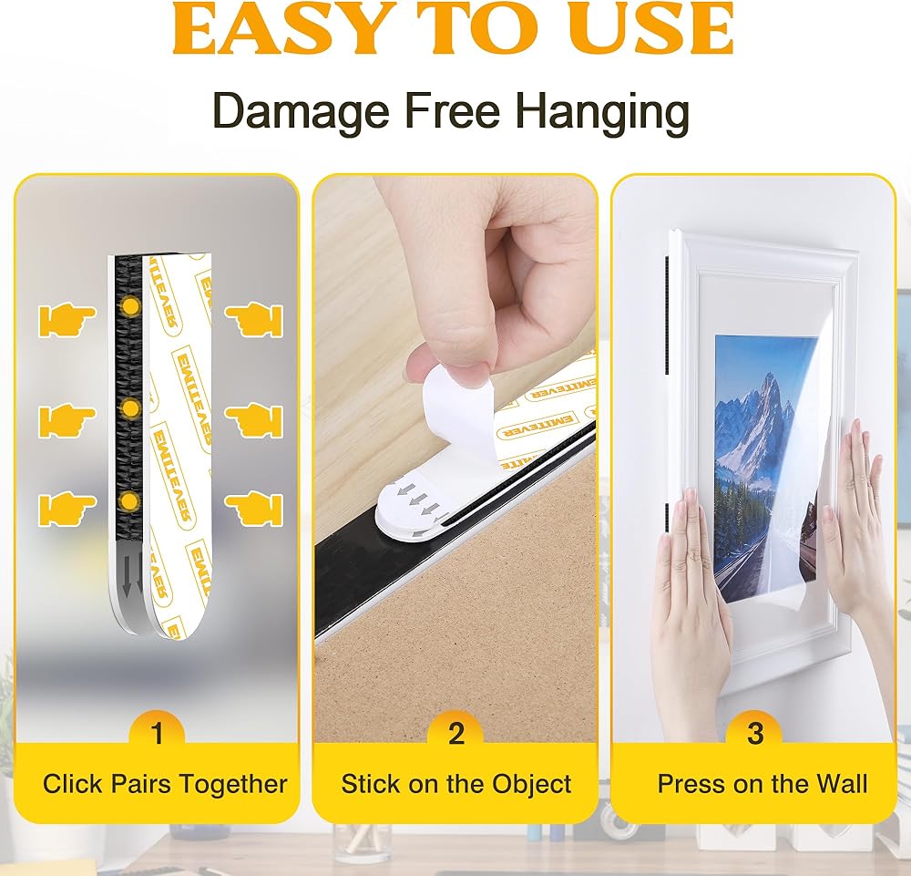 【يزيل بشكل نظيف وسريع】: لإزالة شرائط الحائط المعلقة اللاصقة، ما عليك سوى الضغط على الجزء العلوي من الشريط القابل للإزالة، بالتوازي مع الجدار، واسحبه ببطء ومستقيم نحو الأرض. شرائط التعليق الجدارية من EMITEVER لا تترك أي مادة لاصقة خلفها. مناسبة لديكور مسكنك وشقتك ومنزلك ومكتبك.