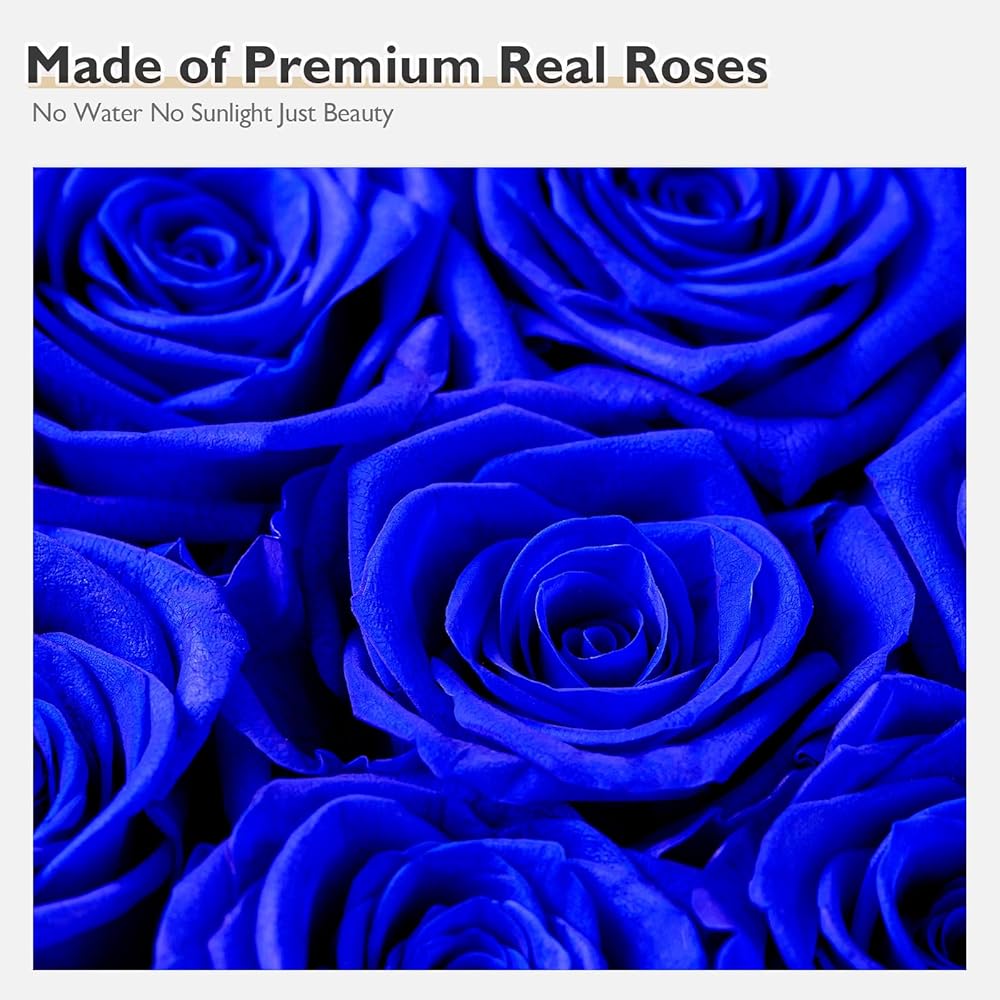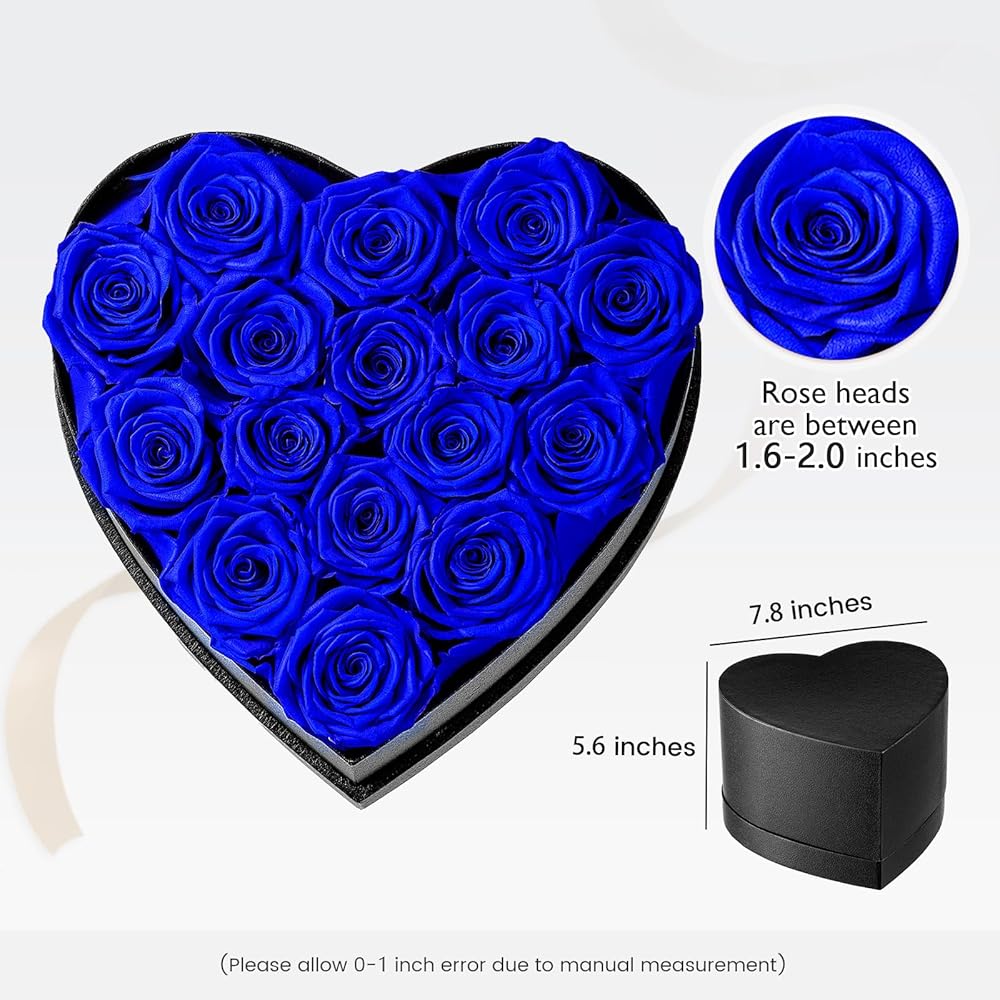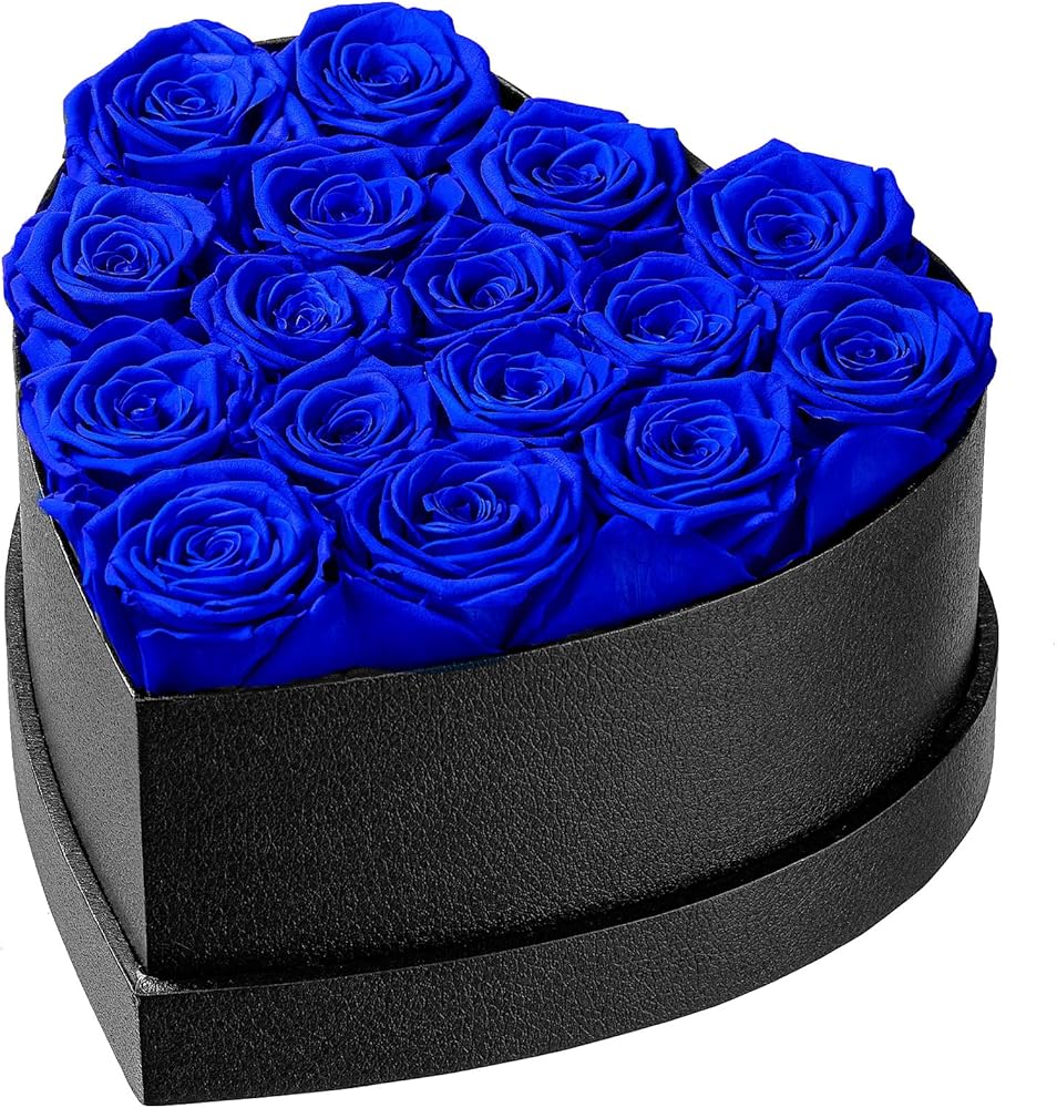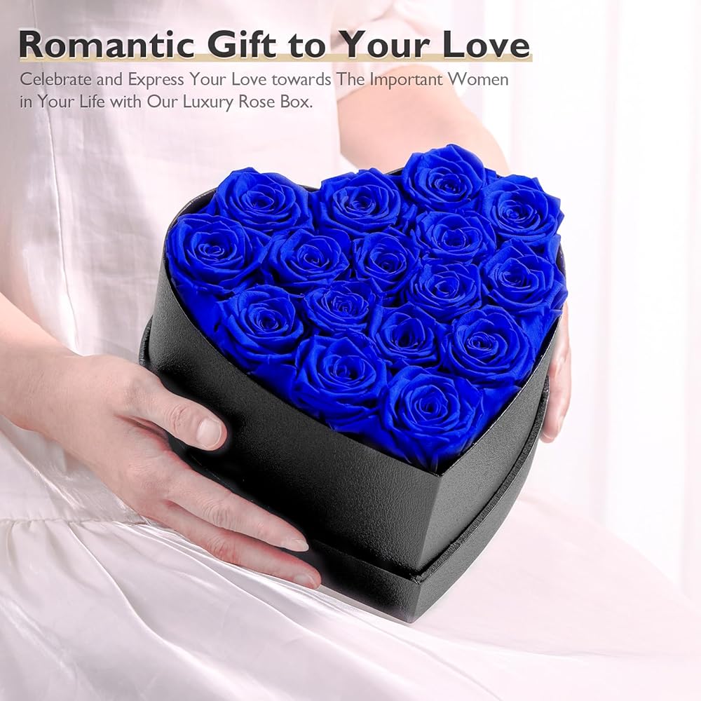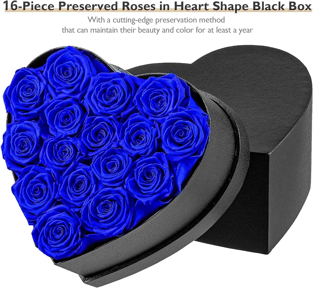 زهور إترفيلد إلى الأبد في صندوق على شكل قلب، ورود محفوظة تدوم لأكثر من عام، هدايا للأم والزوجة وعيد الحب وعيد الأم (صندوق أسود، 16 وردة زرقاء ملكية)