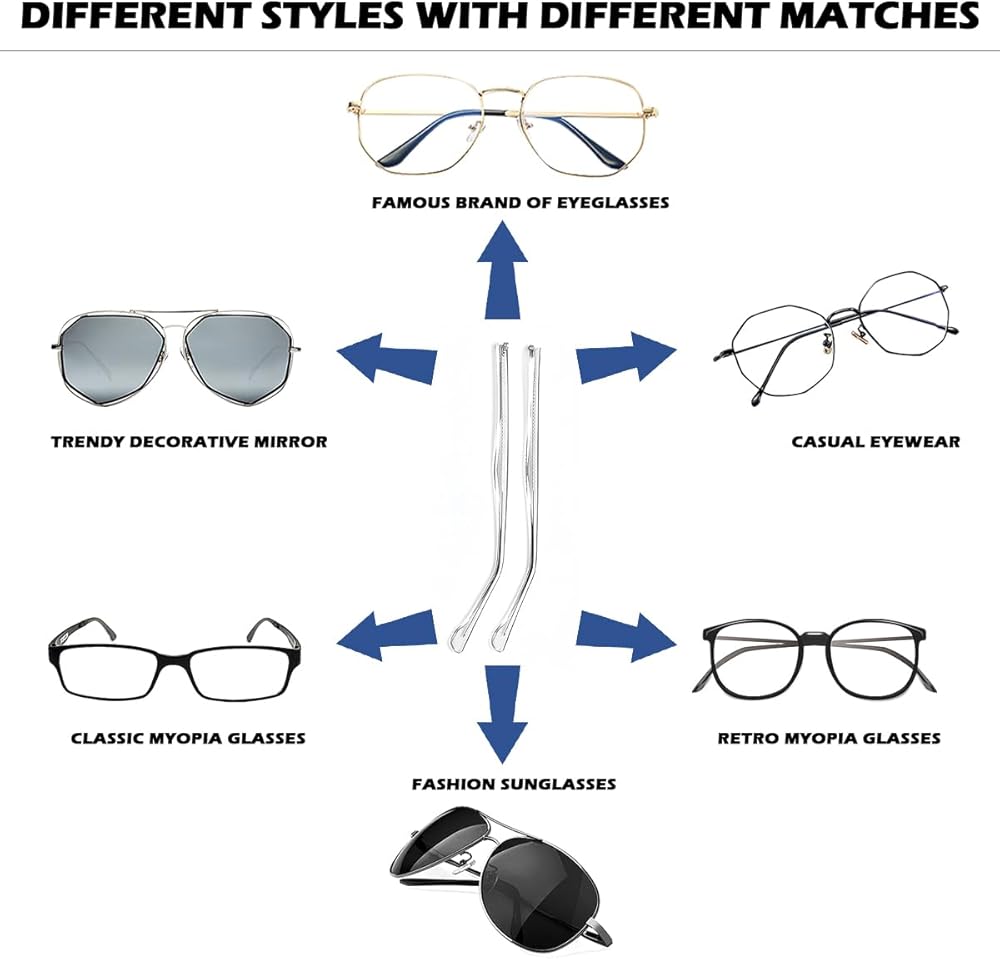 • Wide Application: Glasses replacement arm is suitable for most glasses, such as sunglasses, presbyopic glasses, near-sighted glasses, etc. (Note: Please read the picture of the size at the end of the temples before purchasing to confirm if it fits your glasses)