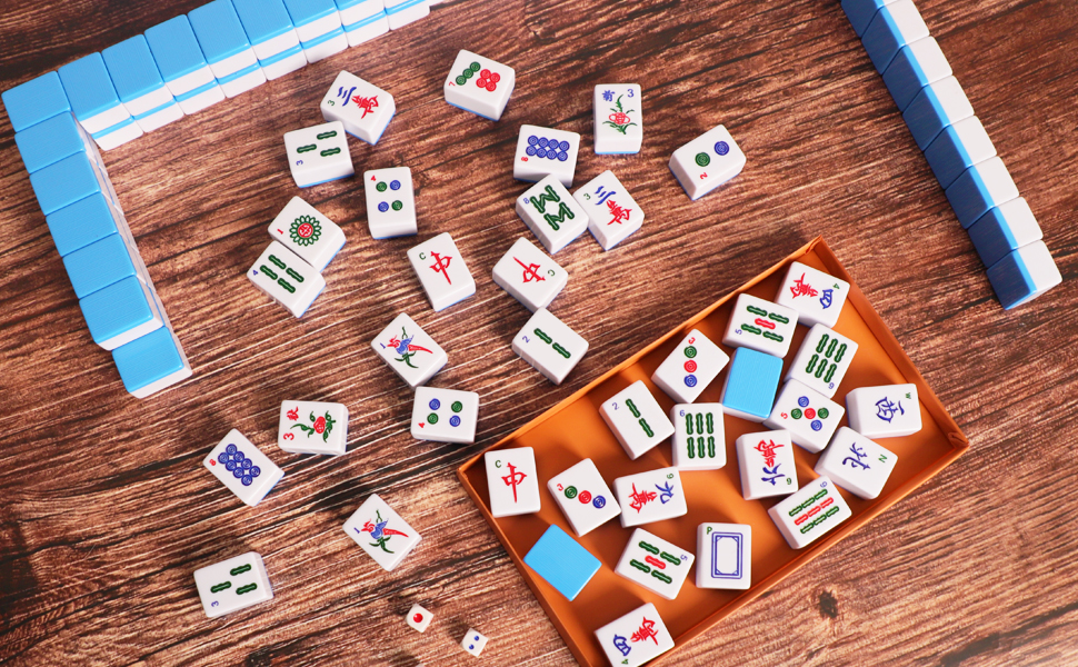 تشمل العبوة: مجموعة ألعاب mah-jong الصينية تأتي مع 144 قطعة مرقمة بلون خلفي أزرق (36 دائرة، 36 خيزران، 36 شخصية، 12 تنين، 16 رياح (N، E، S، W)، 8 زهور ومواسم)، 3 نرد، 2 قطعة احتياطية، مؤشر الرياح، مجموعة من الرقائق الملونة ونسخة من تعليمات اللغة الإنجليزية.
