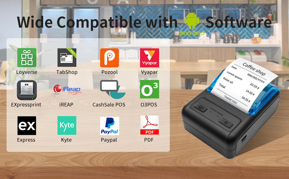 • 【توافق واسع】تدعم طابعة الإيصالات هذه المخصصة للشركات الصغيرة فقط نظام Android وWindows، وتدعم برامج POS مثل: Loyverse (البيع بالتجزئة/الملابس/طباعة الشعار)، iREAP (البيع بالتجزئة/المخزون)، CasierStock (التسوق/إدارة المخزون)، Kyte (الجوال) المبيعات)، Pozool (مطعم/مقهى)، Cashsale POS (مطعم)، ExpressExpense (إيصال الفواتير السريع)، Tabshop (متجر بيع بالتجزئة)، Paypal، Vyapar (بيع السيارات)، 03POS (الخدمات اللوجستية أو المكتبة) وما إلى ذلك.