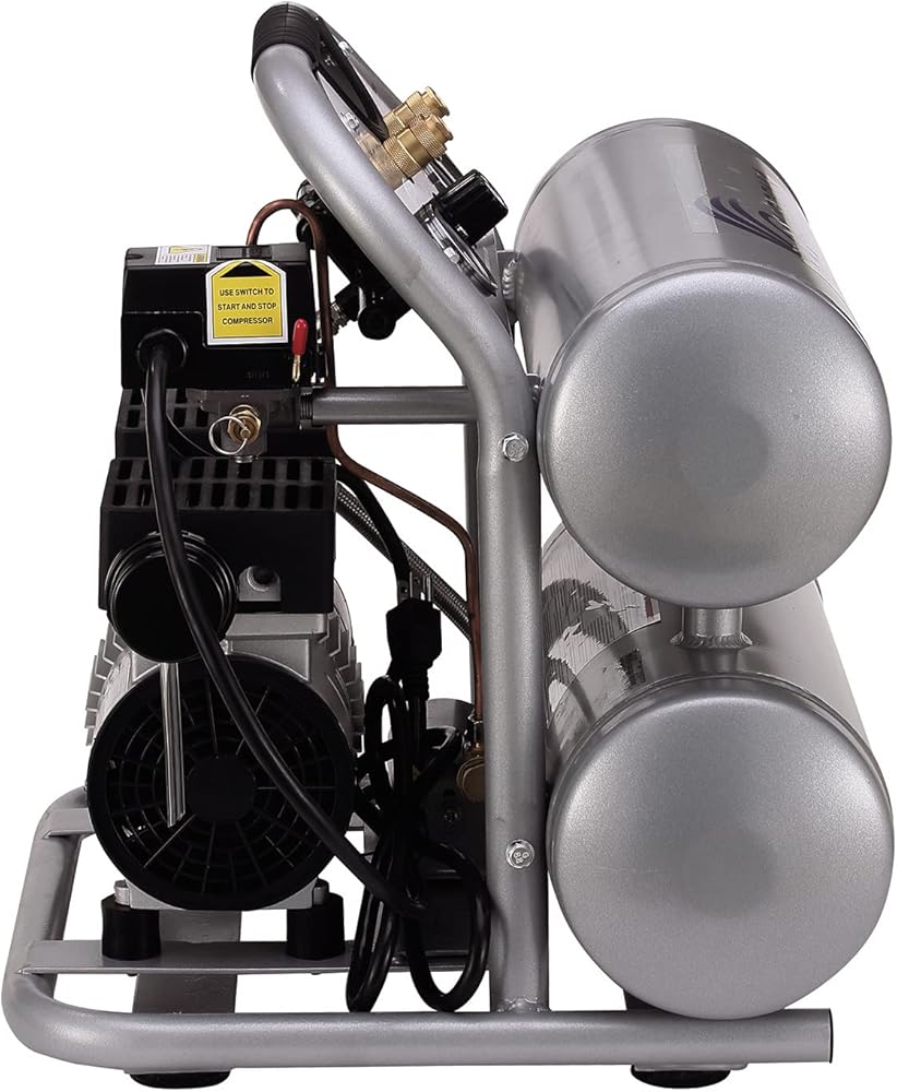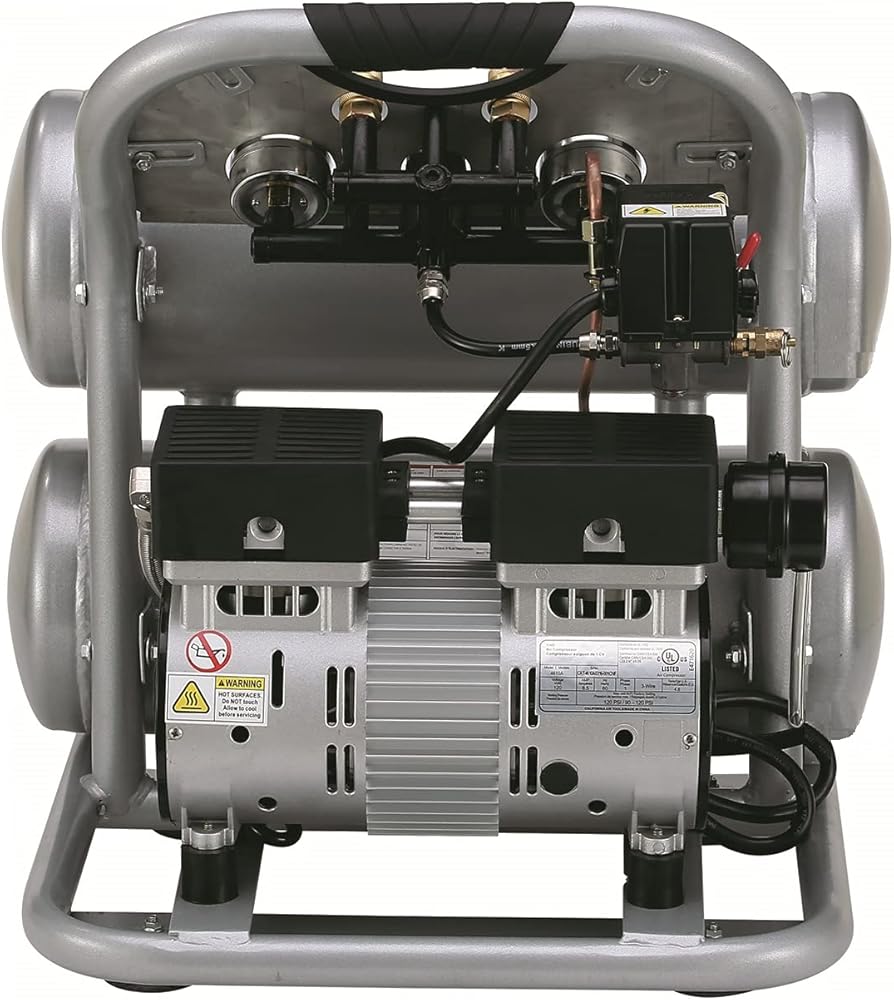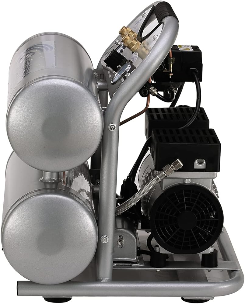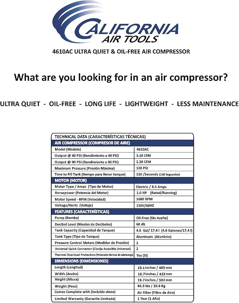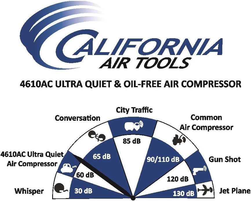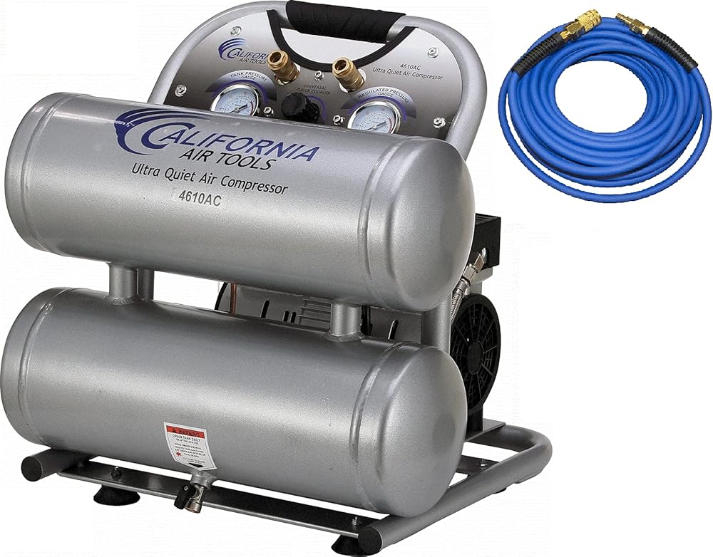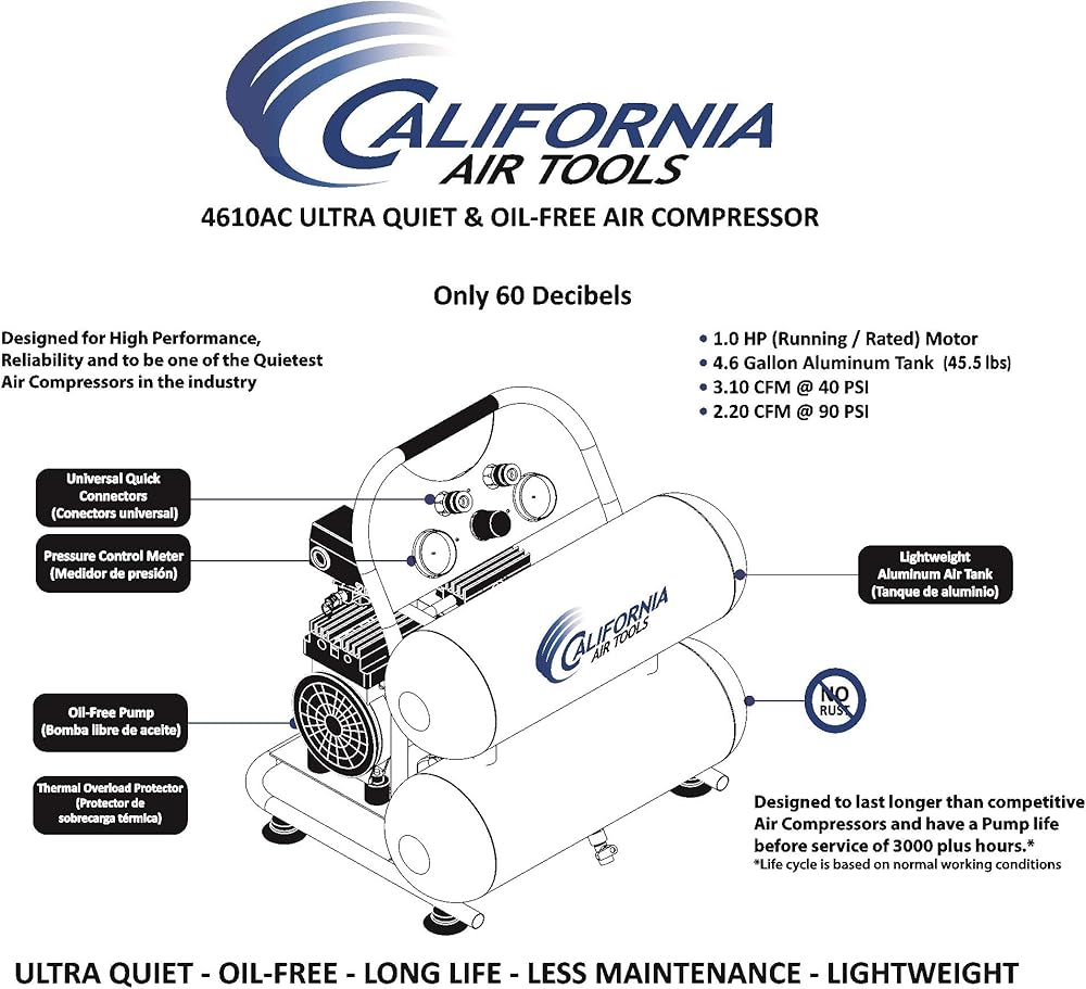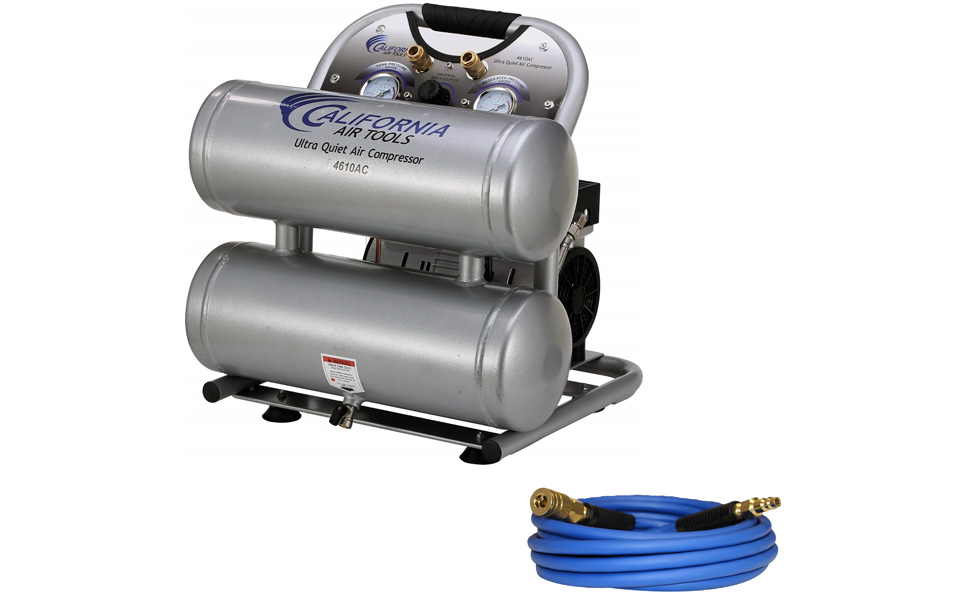 The California Air Tools 4610ACH Ultra Quiet & Oil-Free Air Compressor with 25' Hybrid Air Hose is designed to be one of the quietest air compressors in the industry having only 60 decibels of sound. The powerful 1.0 HP (SP-9413) motor operates at only 1680 RPM creating less noise and less wear. The SP Series of Ultra Quiet Air Compressor Motors have been designed to increase duty cycle and allow for longer continuous run times. The Oil-Free Dual Piston Pump System is engineered for high performance and durability. The CAT-4610AC Air Compressor has a Oil-Free Dual Piston pump designed to have a life cycle before wear of 3000 Plus hours compared to other comparable air compressors with life cycles of 500 hours or less. The Oil-Free pump allows for use in a variety of temperatures and uneven terrains. The 4.6 Gallon Aluminum (Rust-Free) Air Tank is Lightweight (44 lbs) and very easy to transport. This air compressor is ideal for anyone working inside where noise is a major issue.