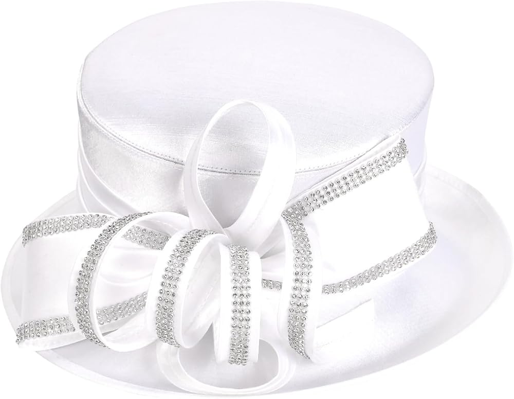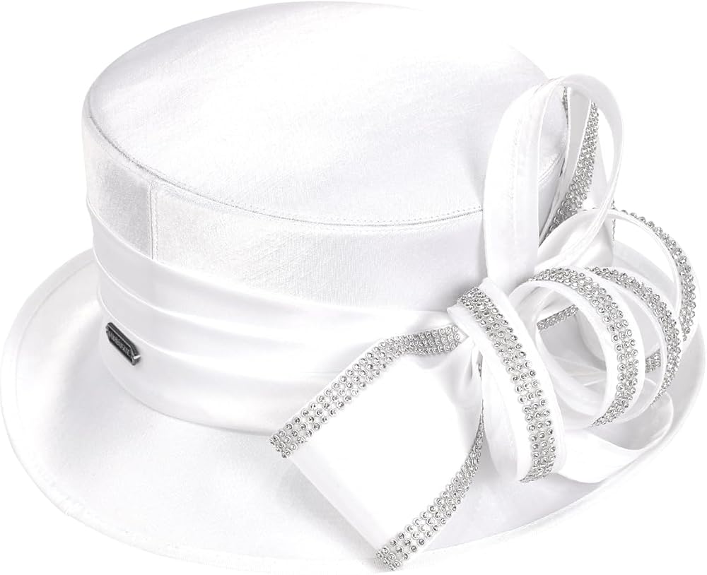 - زهرة شريط من الساتان ولمسة كريستالية ساحرة على جانب واحد من القبعة.