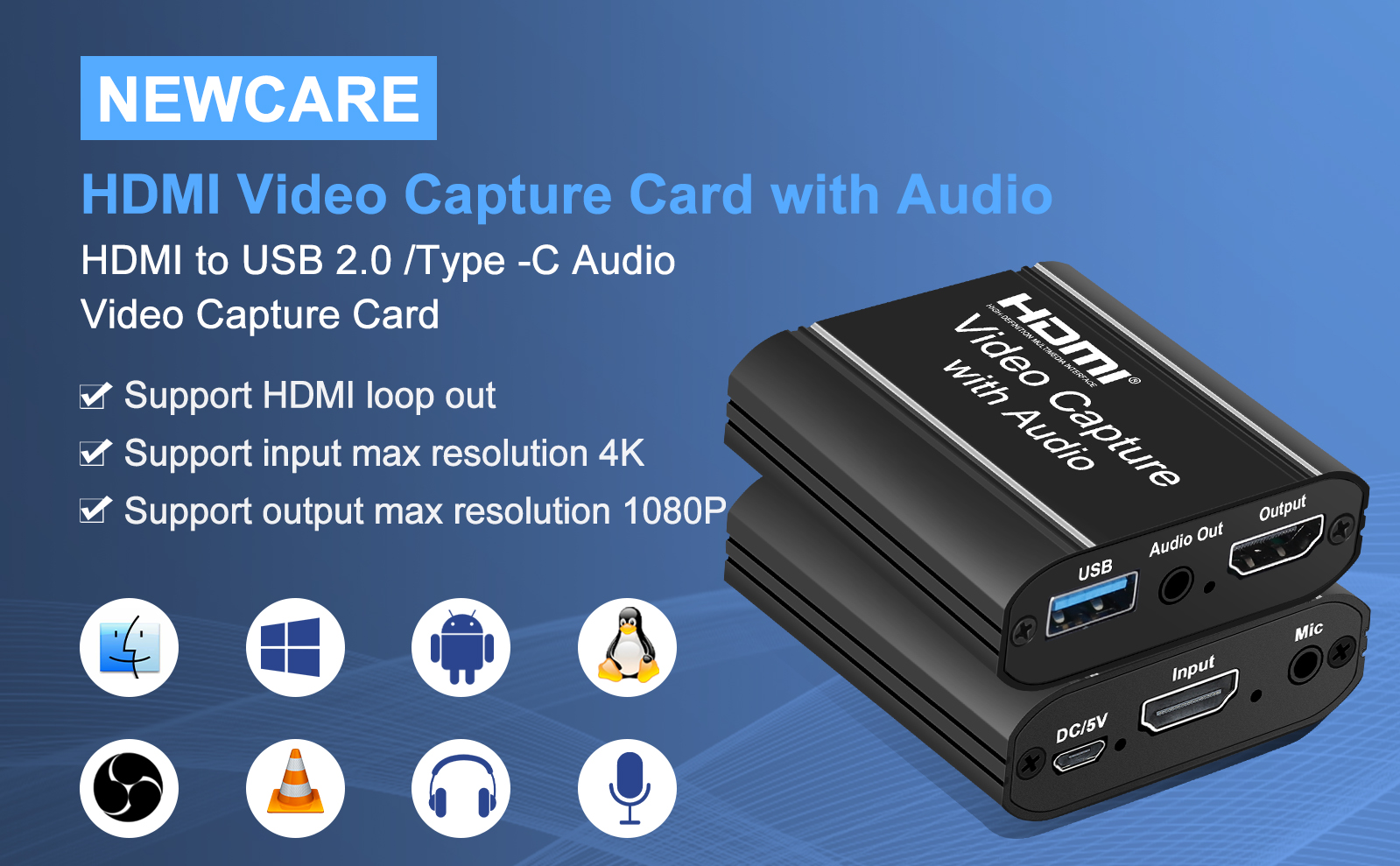 ◀ بطاقة التقاط فيديو HDMI 4K: تحتوي بطاقة التقاط الألعاب HDMI من NEWCARE على شريحة ذكية مدمجة متطورة، والهيكل مصنوع من سبائك الألومنيوم، وهي عصرية وصغيرة الحجم. يمكنه تحويل إشارات الصوت والفيديو إلى الكمبيوتر والهاتف الذكي للمعاينة والتخزين. دعم حلقة الفيديو، ومناسبة للحصول على دقة عالية، وتسجيل التدريس، والتصوير الطبي، وما إلى ذلك.