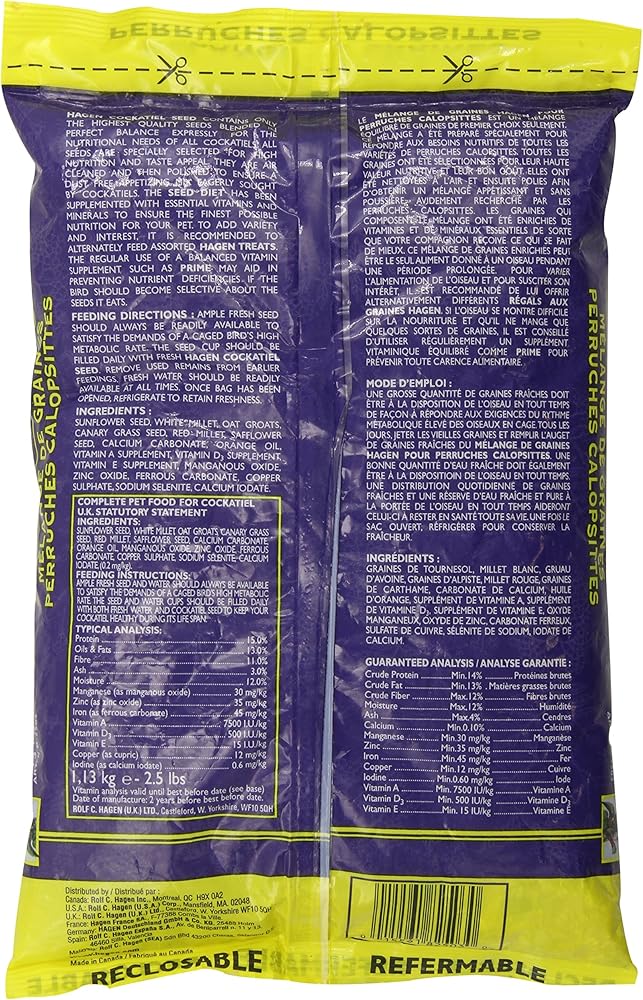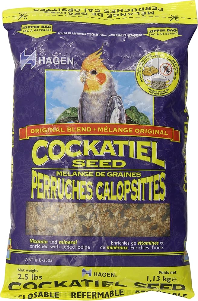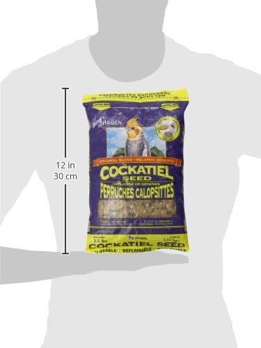 Hagen cockatiel seed contains only the highest quality seeds blended in a perfect balance for the nutritional needs of all cockatiels. The seeds are specially selected for high nutrition and taste appeal. The seeds are air cleaned and then polished, producing a dust-free and appetizing mix eagerly sought by cockatiels. The seed diet is supplemented with essential vitamins and minerals to ensure the finest possible nutrition for your pet bird. To add variety and interest, alternately feed assorted hagen treats. The regular use of a balanced vitamin supplement such as prime may help prevent nutrient deficiencies if the bird becomes selective about the seeds it eats. Feeding guide - ample fresh food and water should always be available to satisfy the demands of your pet bird. The food and water cups should be cleaned and re-filled daily with fresh water and fresh seeds to keep your pet bird healthy. Ingredients are white millet, oat groats, black oil sunflower seed, canary grass seed, red millet, safflower seed, canola oil (preserved with mixed tocopherols), calcium carbonate, orange oil, ferrous carbonate, manganous oxide, zinc oxide, niacin, vitamin e supplement, d-calcium pantothenate, copper sulfate, riboflavin, pyridoxine hydrochloride, vitamin a supplement, thiamine mononitrate, calcium iodate, folic acid, biotin, vitamin b12, sodium selenite, vitamin d3 supplement. Comes in 2.5-pound plastic bags. Measures 12-1/2-inch length by 7-inch width by 1-1/2-inch height.