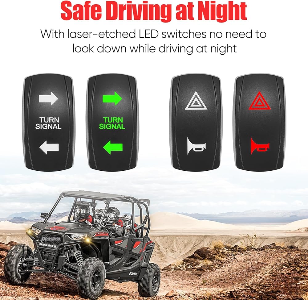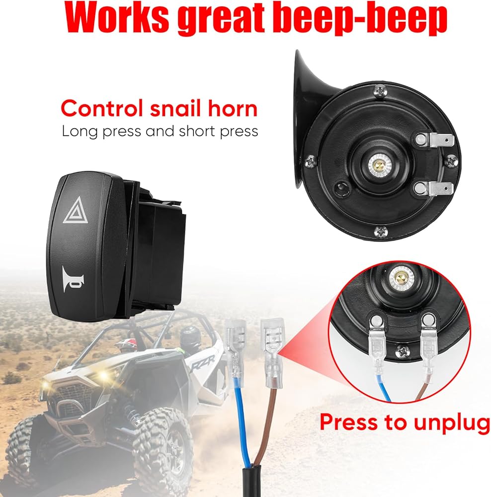 【قرن قوي】: تتضمن مجموعة إشارة الانعطاف Blogole UTV قرنًا ينبه بشكل فعال المركبات والمشاة القريبة دون إخافتهم. قم بتنشيط البوق بضغطات قصيرة أو طويلة، ويتوقف بمجرد تحرير الزر. تأتي مجموعة البوق الكهربائي مع مفتاح مرن لسهولة التشغيل، ويتميز بمفتاح LED محفور بالليزر للرؤية في الظلام.