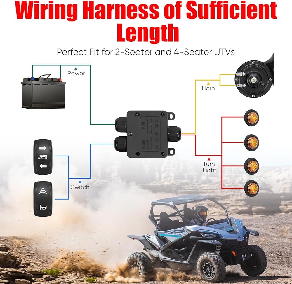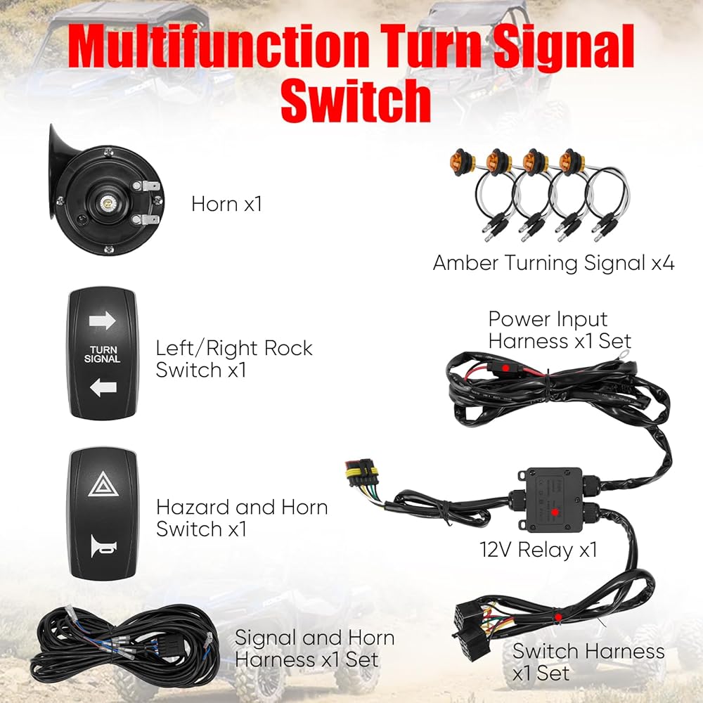 مجموعة إشارة الانعطاف UTV ATV السلكية مسبقًا، مجموعة قانونية عالمية للشارع مع مفتاح هزاز للقرن/المخاطر/الوامض، تصميم التوصيل والتشغيل، متوافق مع Polaris RZR، Can-Am، Kawasaki، Pioneer، CFMOTO