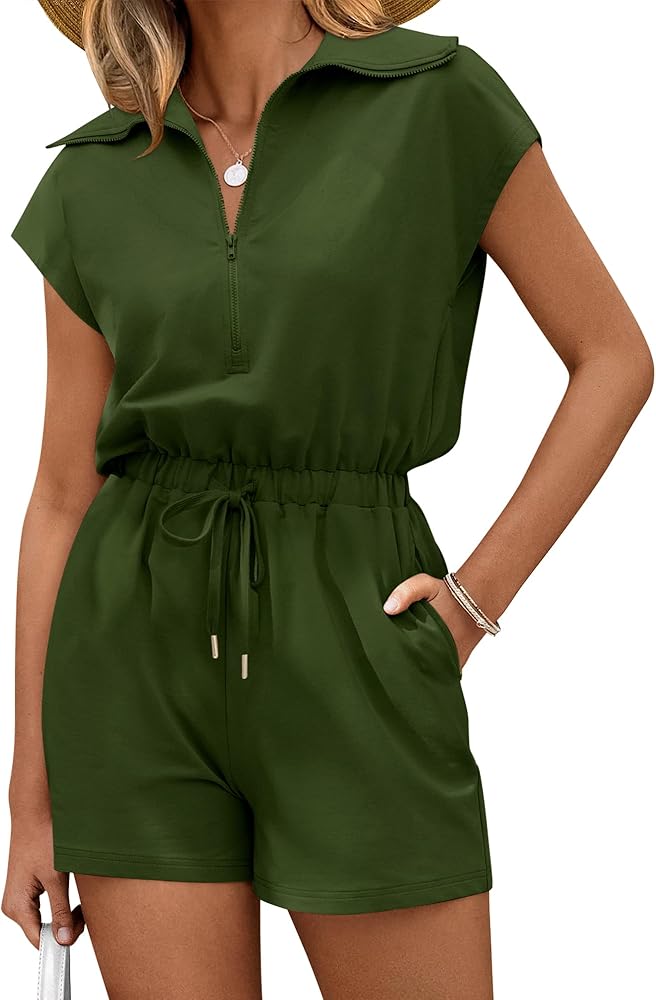 MIHOLL ثوب فضفاض للنساء 2024 صيفي قصير الأكمام نصف سحاب غير رسمي فضفاض بذلة قطعة واحدة وتتسابق مع جيوب