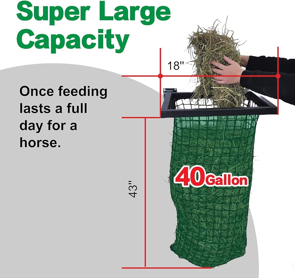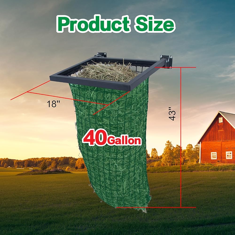 إطار تغذية القش بسعة 40 جالون، وحدة تغذية بطيئة للقش مع شبكة من النايلون، إطار حديدي بالكامل وجزء علوي مفتوح واسع، رف قش مثبت على الحائط للخيول/الماعز، أسود